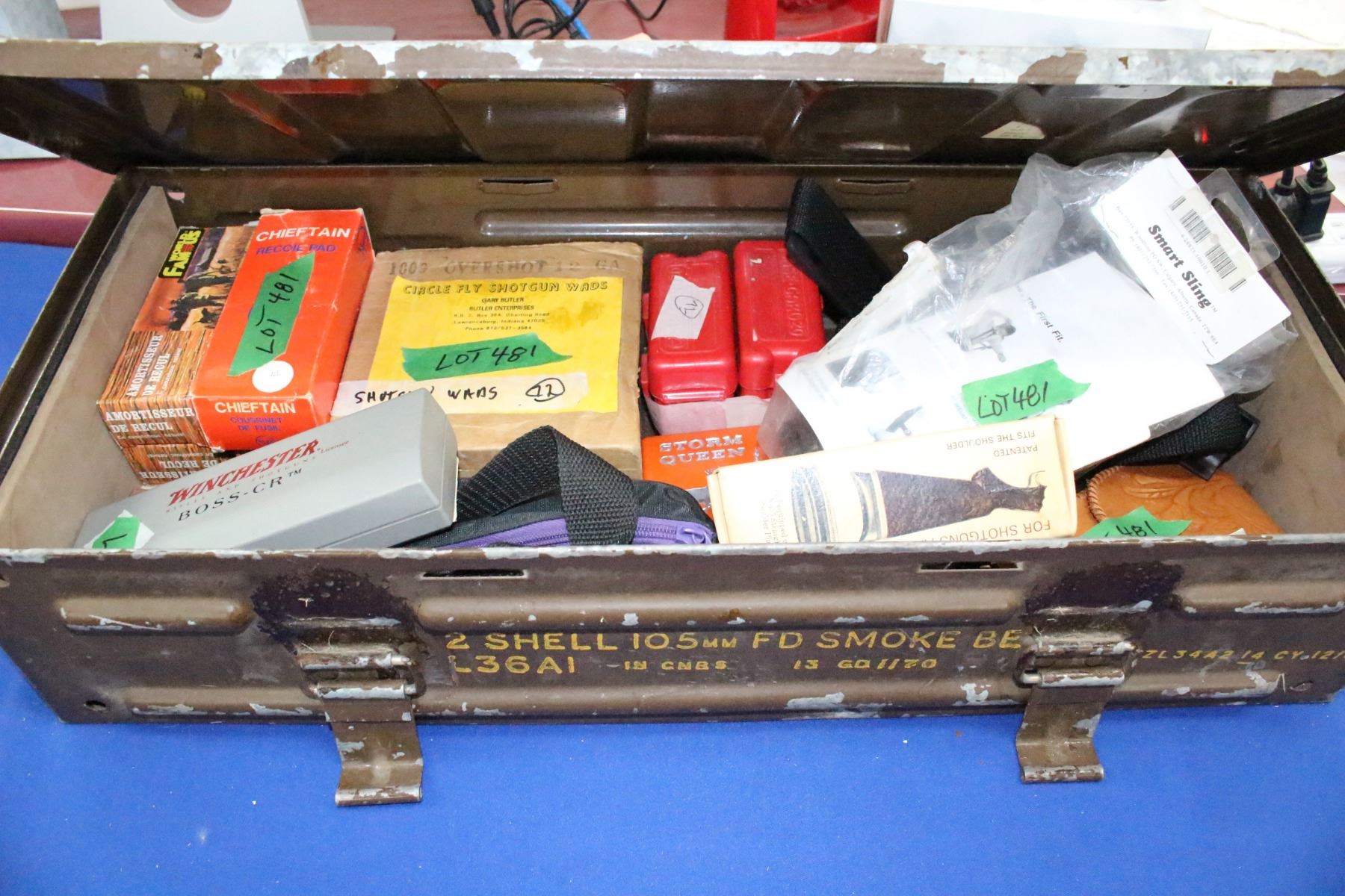 A 2-Shell, 105mm Metal Ammo Box w/7 Recoil Pads, Box of Shotgun Wads, Pistol Cleaning Rods, 2 Caseguard Boxes, 2 Holsters, Flip-off Lens Caps, 2 Smart Slings, a Waist Bag & Muzzle Flash for Winchester Rifles