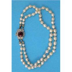 A 2-row pearl bracelet, the white gold clasp set with an oval ruby bordered by small diamonds stamped Schilling £250-350
