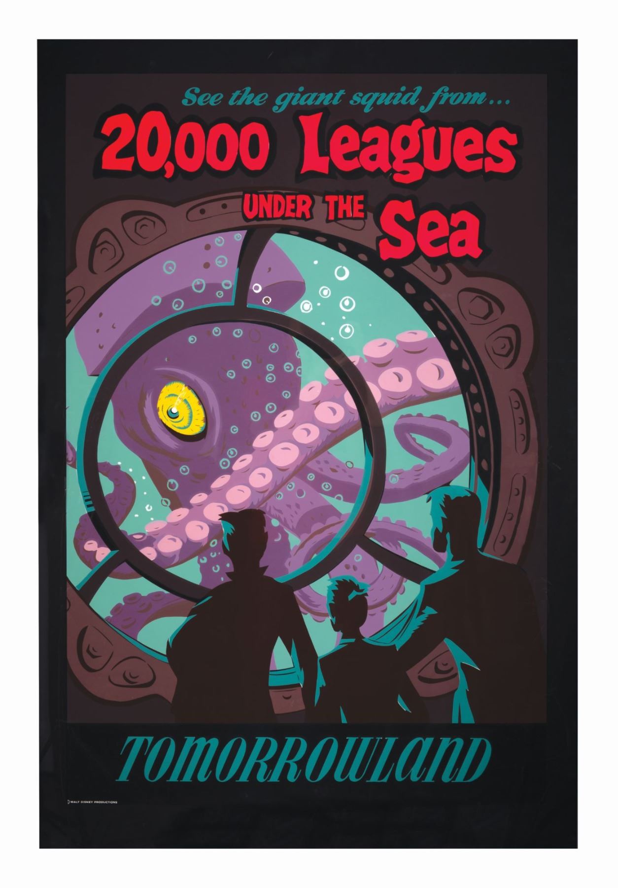 (Disneyland, 1956) An original hand-silkscreened poster for the "20,000 Leagues Under the Sea" attraction in Tomorrowland. Designed by Bjorn Aronson, this colorful poster features strong graphics and brilliant colors that make this one of the most collectible posters from the park. Measuring 36"x54", the poster is in fine condition.