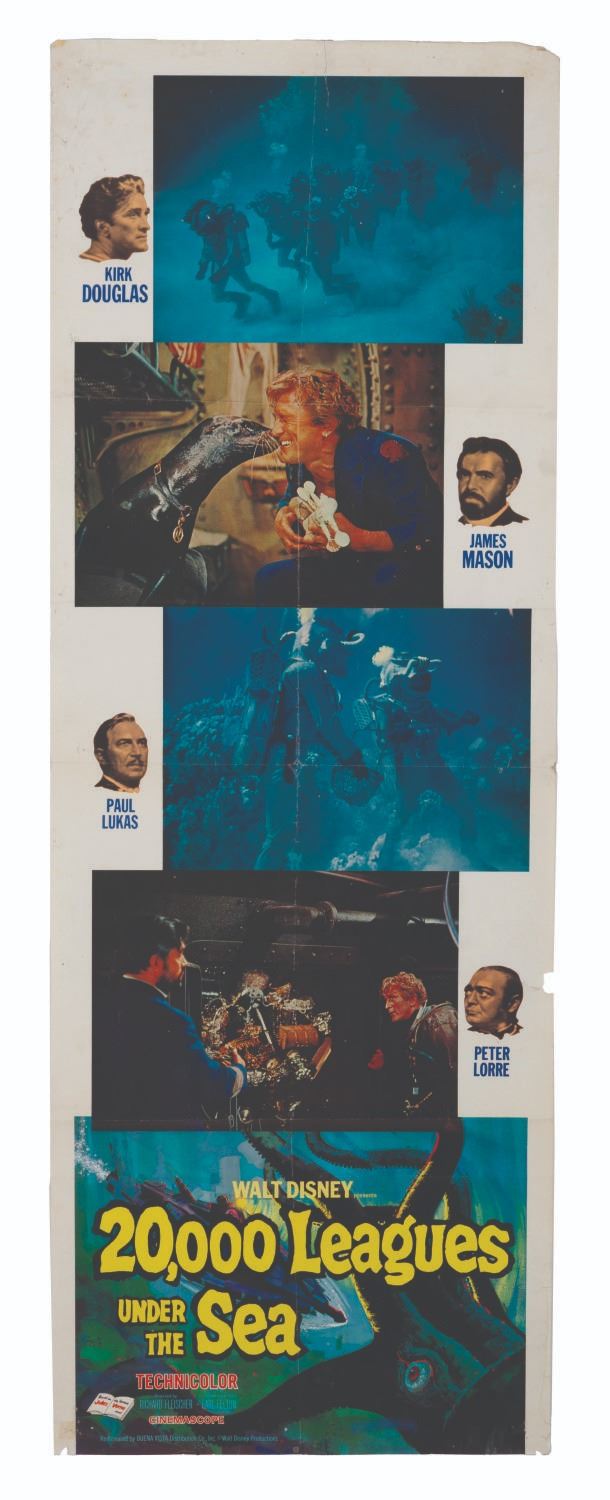 (Disney, 1963) An original 1963 theatrical release door panel poster for "20,000 Leagues Under the Sea." Measuring 20” x 55”, the poster displays in fair condition with pinholes, tears, folds, paper loss, creases, water damage, wear, and tape repair on the reverse.