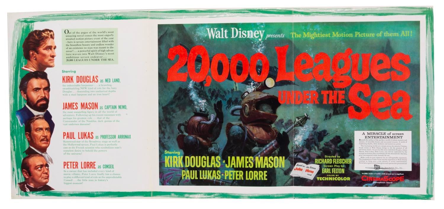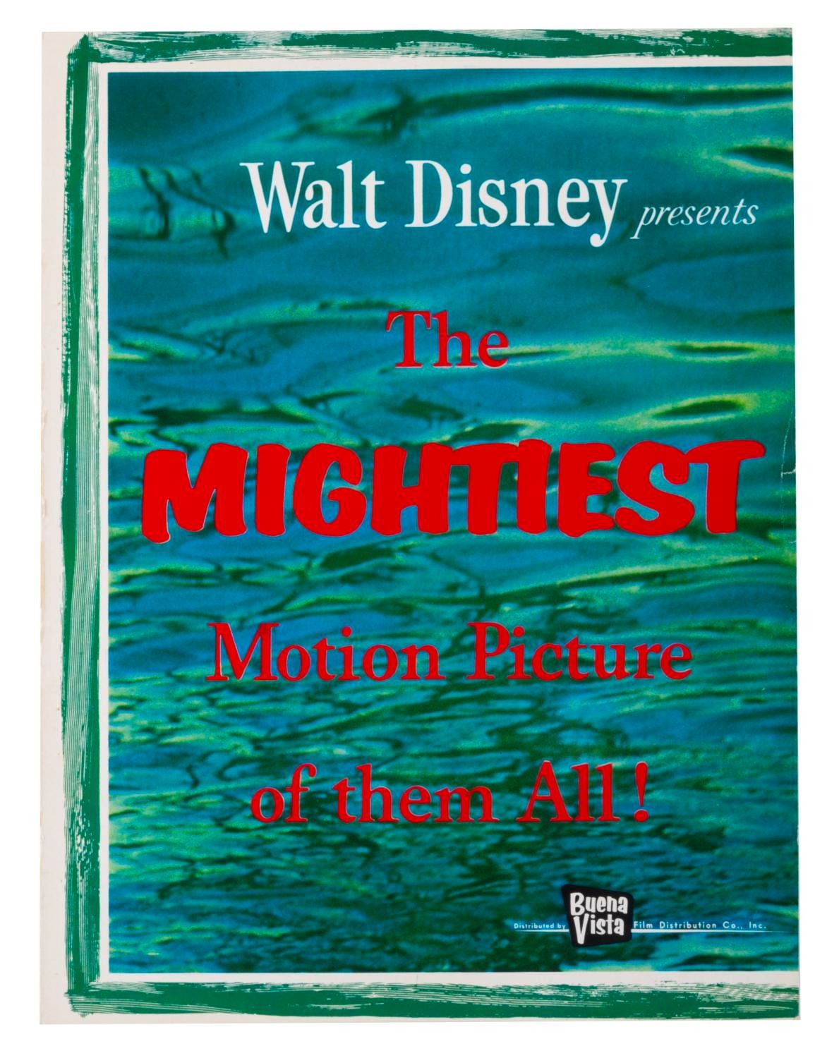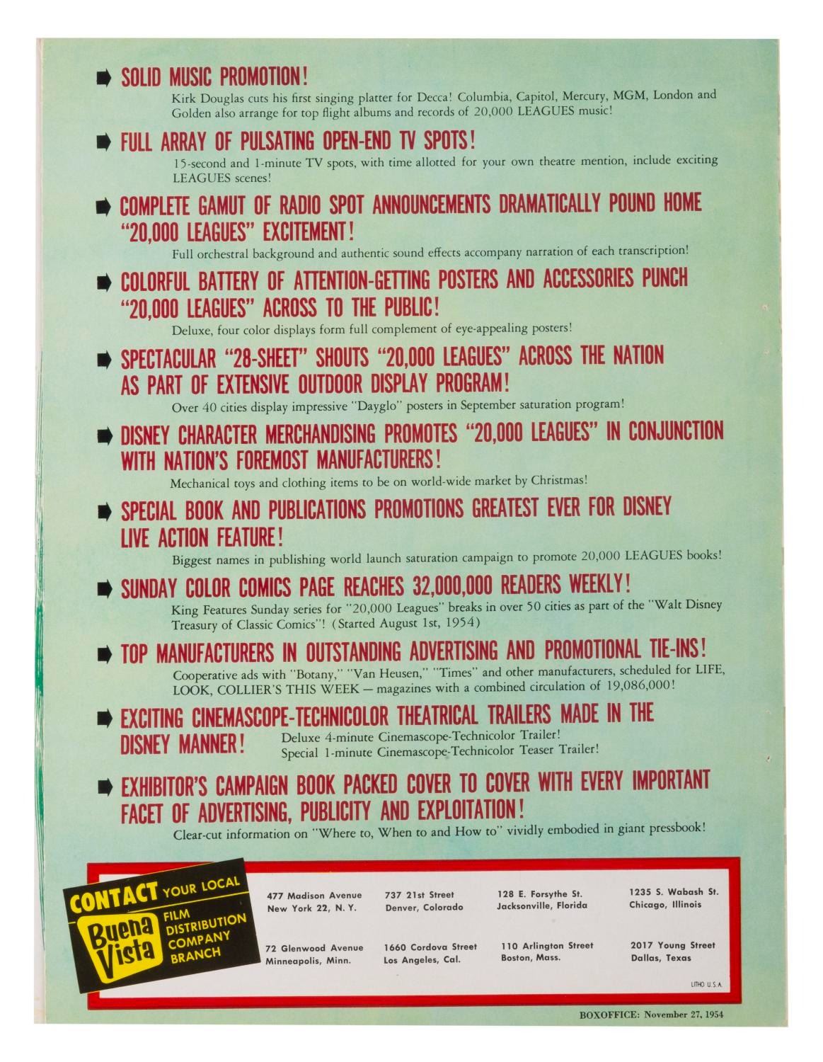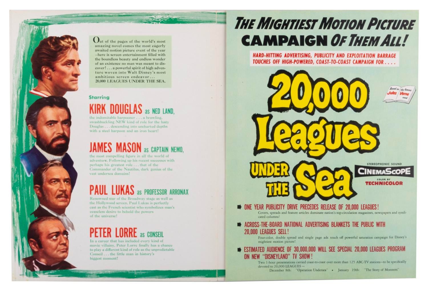 (Disney, 1954) A fold-out “20,000 Leagues Under the Sea” exhibitor’s guide cut from the November 27, 1954 issue of Box Office Magazine. The guide describes the marketing blitz for Walt Disney’s ambitious underwater epic. Measuring 9.25” x 12.25”, the guide displays in very good condition with staple holes, edge wear, scratches, creases, and wear.