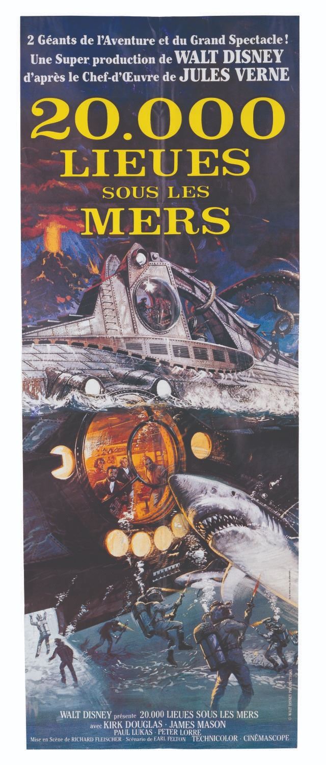 (Disney, 1970) A French Pantalon poster for the 1970 re-release of Walt Disney's "20,000 Leagues Under the Sea." Measuring 23" x 62", the poster displays in very good condition with original folds, and some waviness to the paper from light exposure to water.