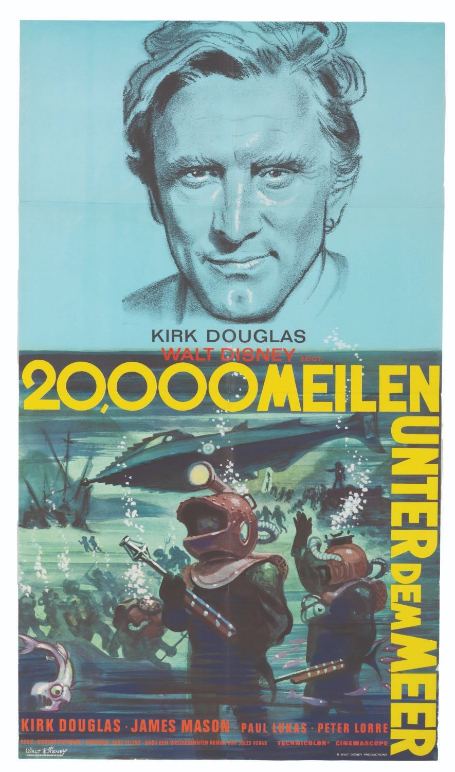 (Disney, 1960s) A German poster for Walt Disney's "20,000 Leagues Under the Sea." The "Walt Disney Filmverleih GMBH" distribution logo indicates this was for a German rerelease of the film in the mid-1960s. Measuring 40.5” x 23”, the poster is in very good condition with light wear along edges and original folds, and slight separation at centerfold points.