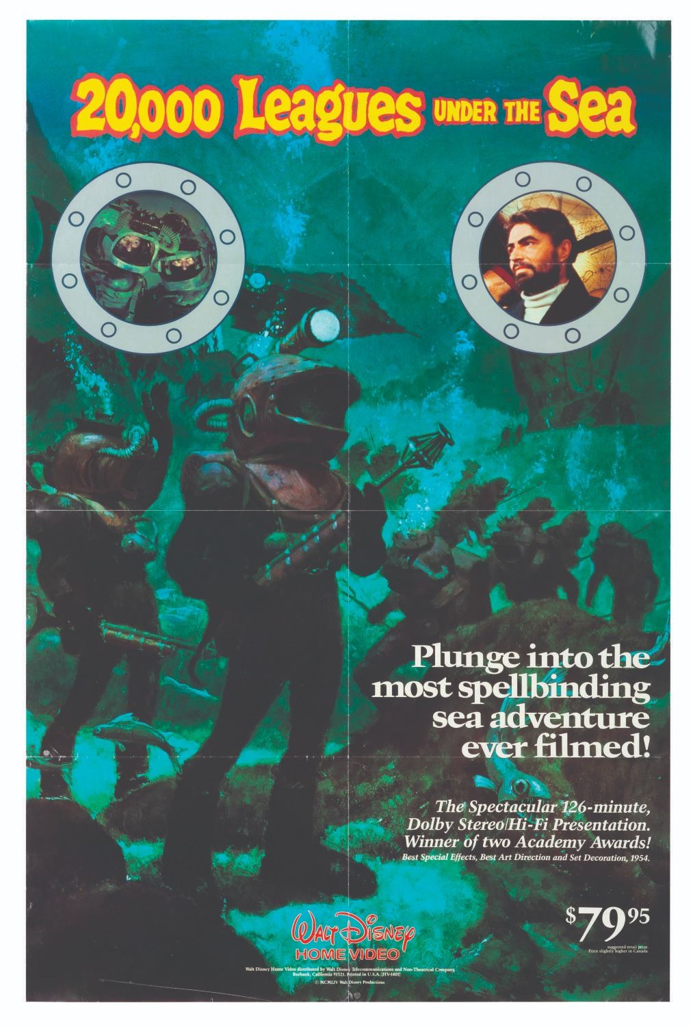 (Disney, 1980s) A poster for the home video VHS release of Walt Disney’s 1954 “20,000 Leagues Under the Sea.” Measuring 26” x 40”, the poster is in good condition with original folds, creases, a 7” long scratch at the bottom, wear to edges and along the original folds, and 2” of separation at the top center fold line.