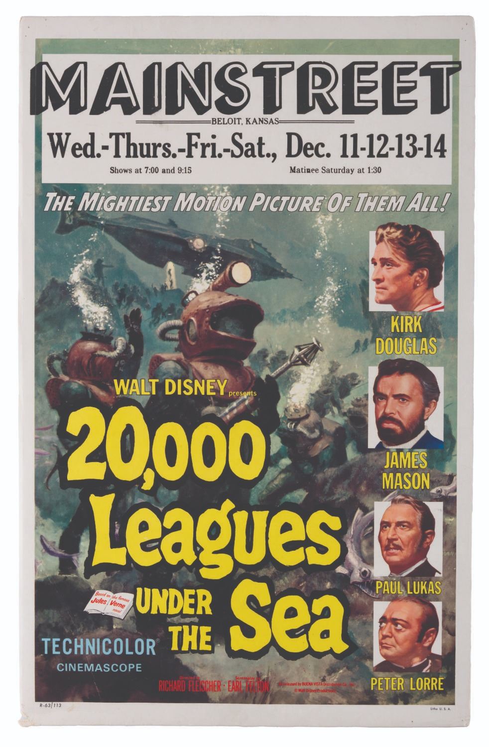 (Disney, 1963) A window card for the 1963 re-release of "20,000 Leagues Under the Sea.” This card is from the Main Street theater in Beloit, Kansas, and displays showtimes at the top. Measuring 14” x 22”, the window card displays in good condition with creases, pinholes from display, and edge wear, including a tear at the bottom left corner.
