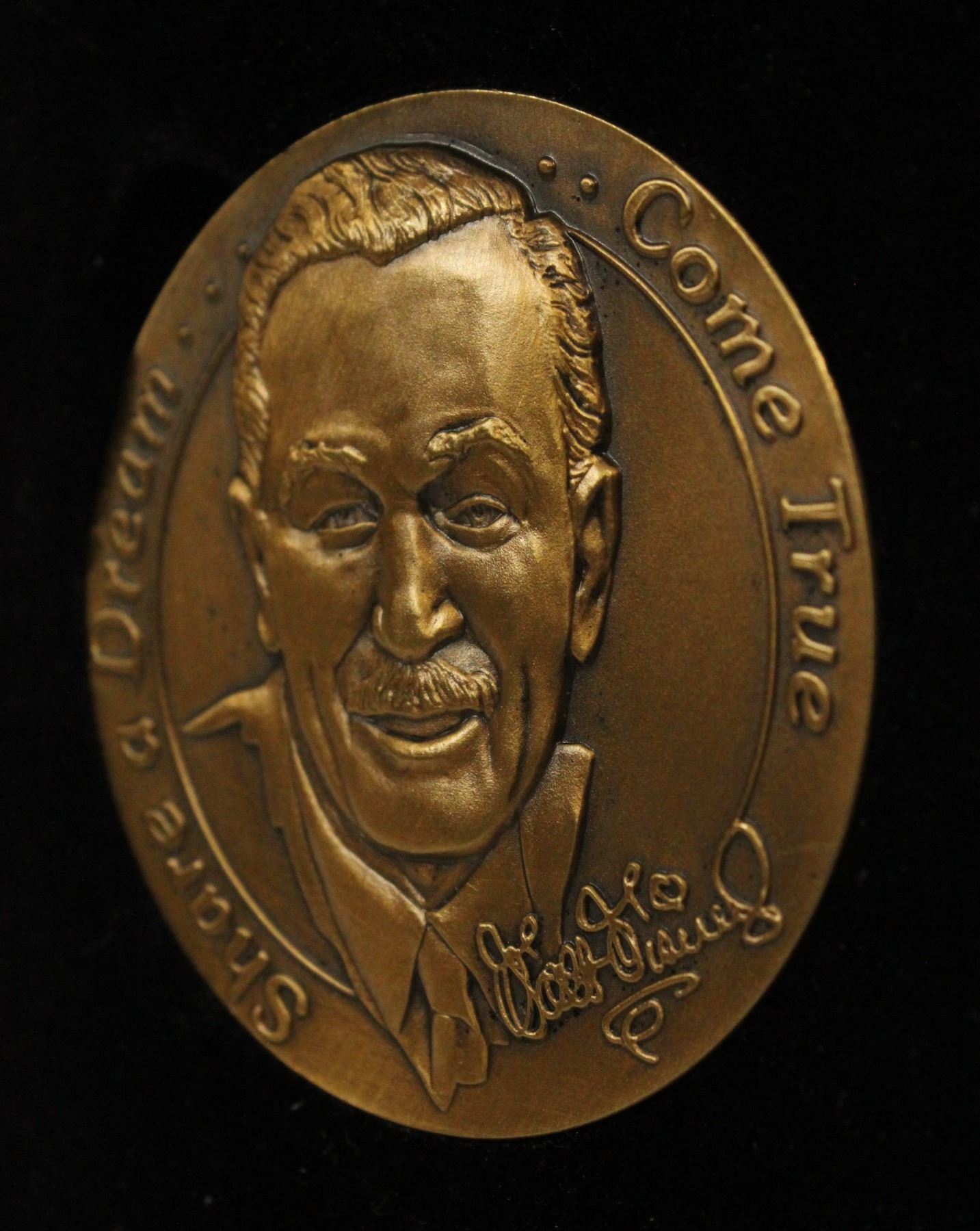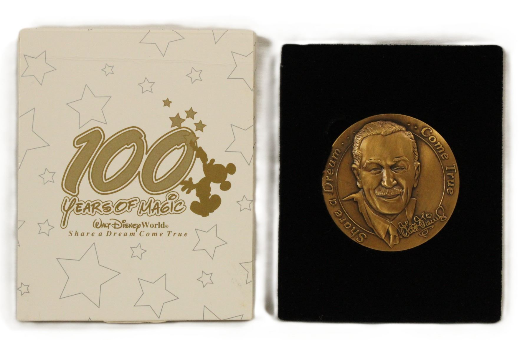 This large gold colored coin features an image of Walt Disney with signature and the front and the phrase "Share a Dream....Come True". The back features Mickey Mouse and a filed of stars with the phrase 100 years of magic Walt Disney World at the center. The outer ring includes the words " Cast Holiday Celebration 2001. The coin is in mint condition and includes a felt covered easel and cardboard display case.