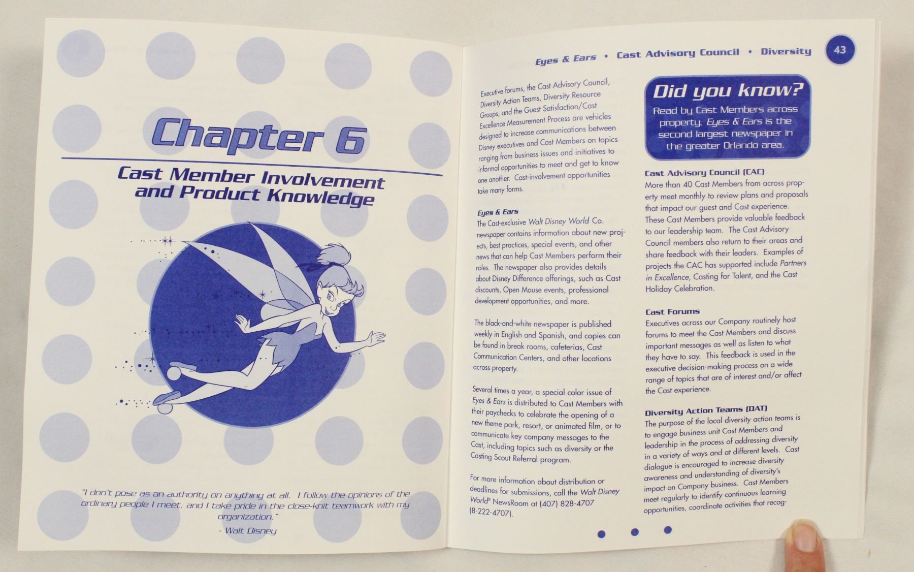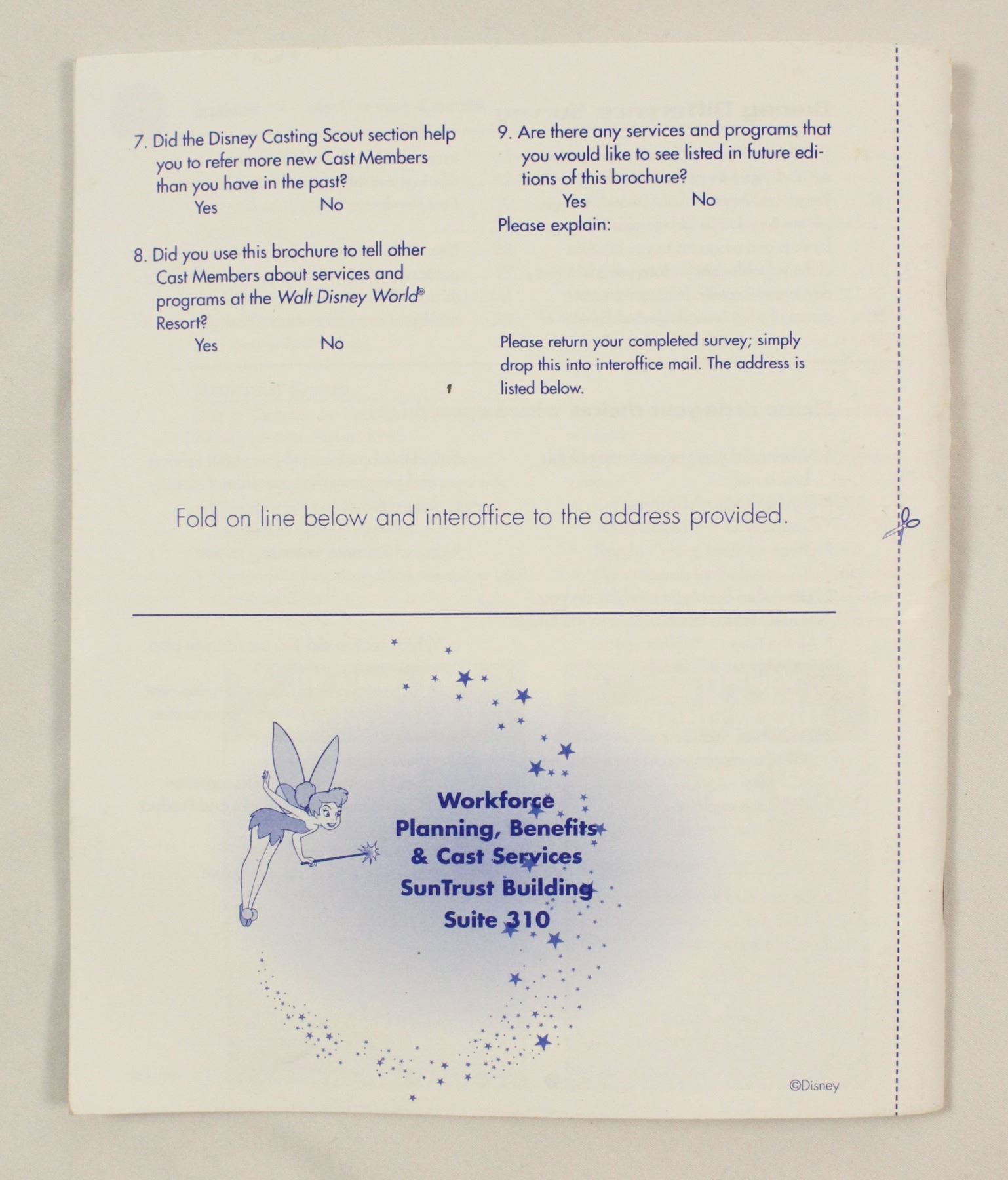 This brochure was given to cast members in 2001. Titled The Disney Difference, it highlights what services, programs and activities that were available to cast members including discounts, education, health and welfare, career development and recognition.