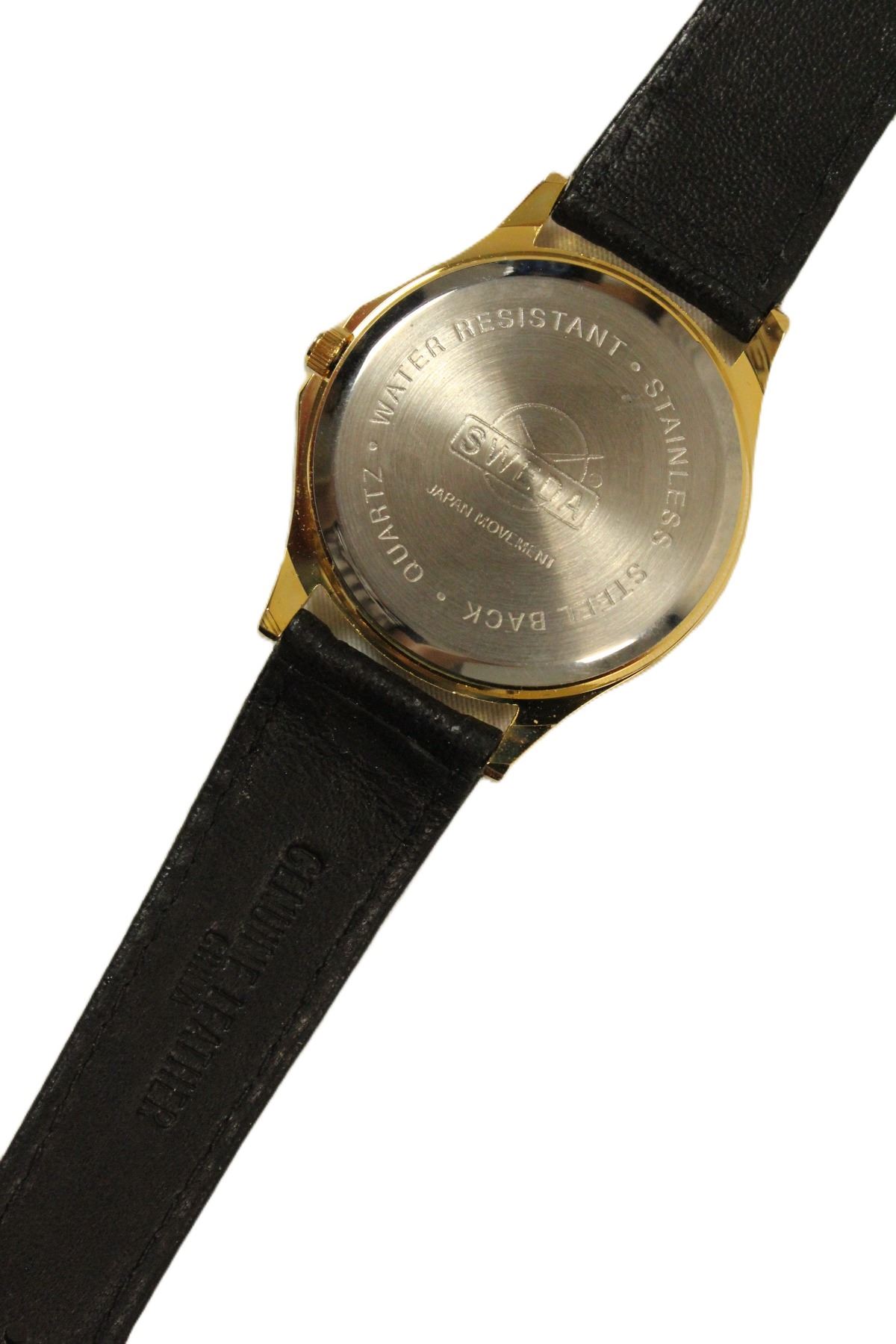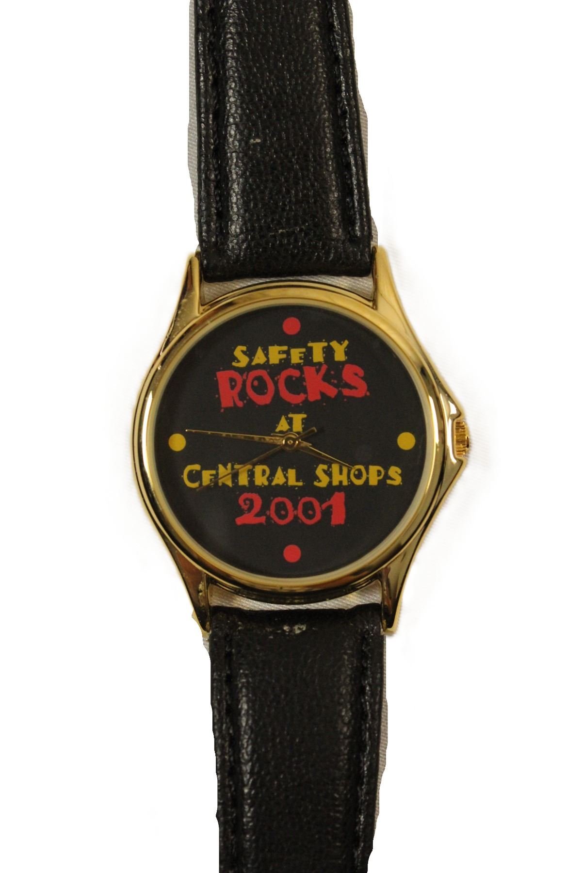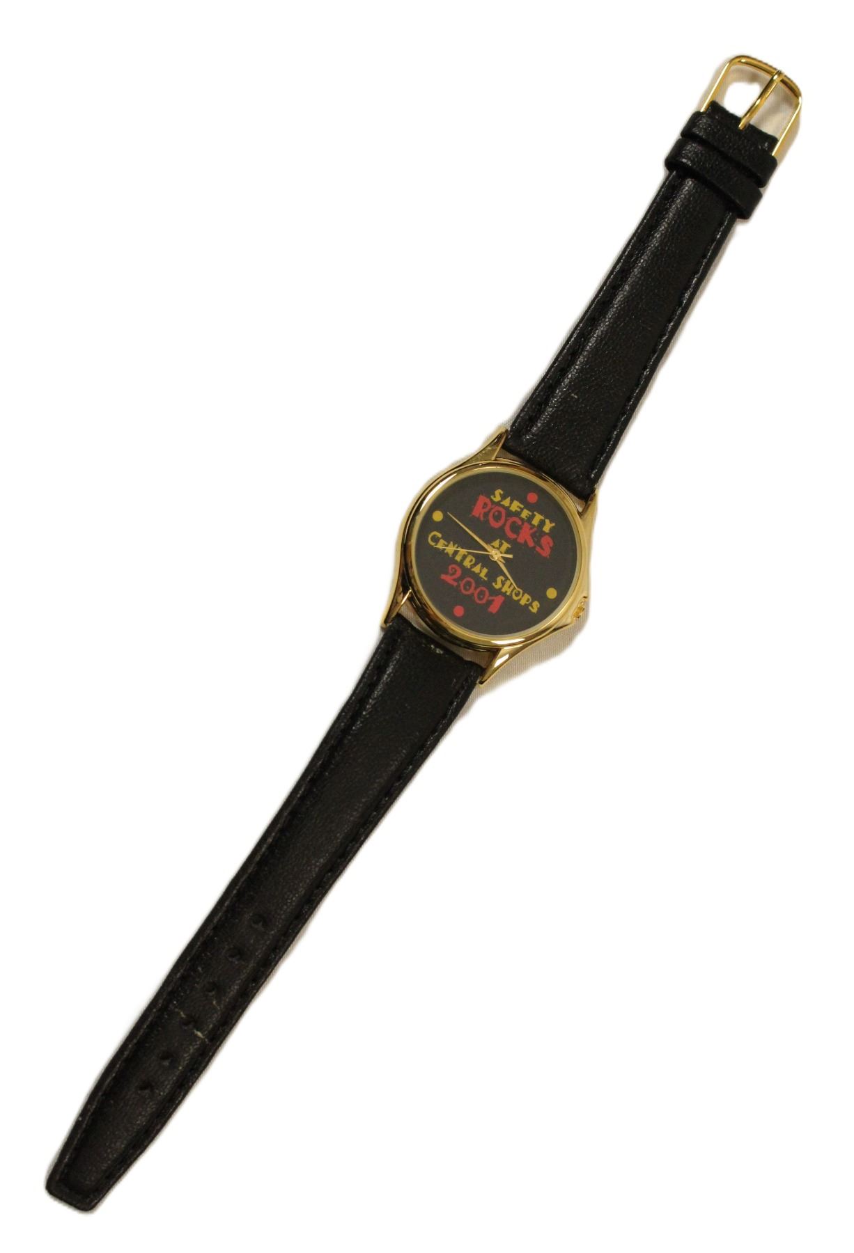 Gold colored Cast Member exclusive watch with black genuine leather band. The watch is in new condition with protective sticker still on the face. The watch face features a black background with the phrase "Safety Rocks at Central Shops 2001". The watch appears to have never been worn.