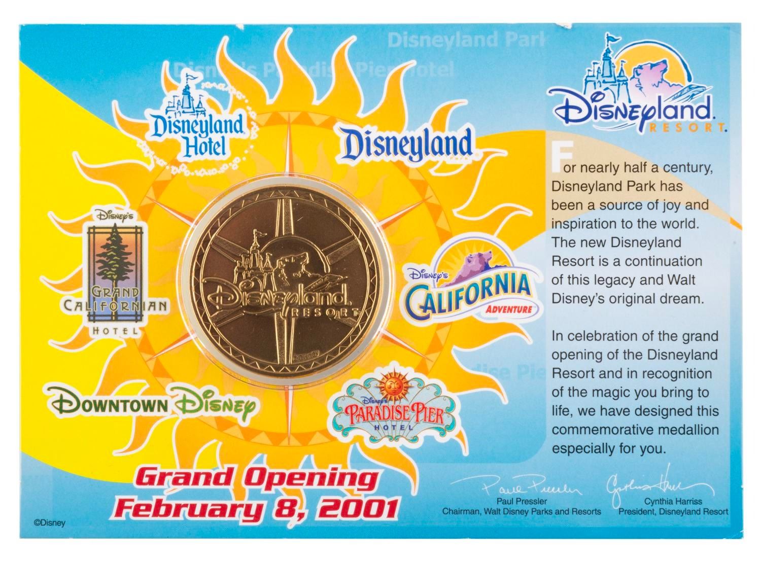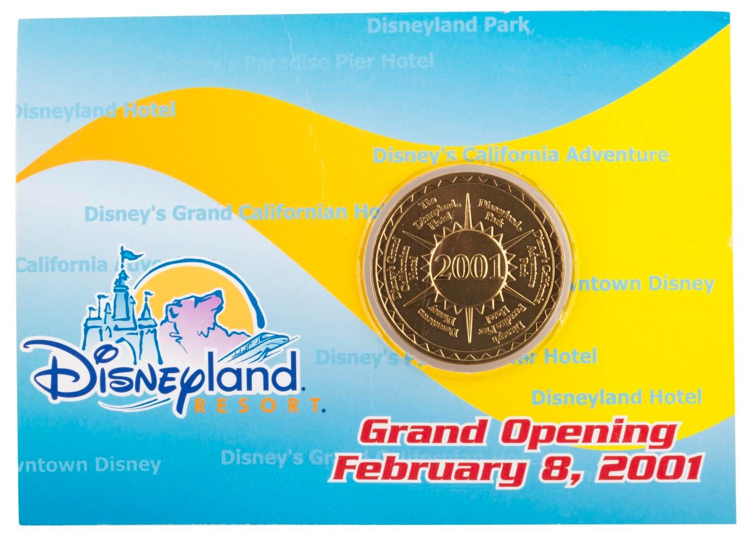 (Disneyland Resort, 2001) A commemorative coin for the Grand Opening of Disney’s California Adventure, Downtown Disney, and Disney’s Grand Californian Hotel, as part of the Disneyland Resort on February 8, 2001. The double-sided coin features the Disneyland Resort logo and the year 2001 on the reverse. Contained within the original card backing, the coin measures 5" x 7" and is in very good condition with creasing and edge wear to the card.