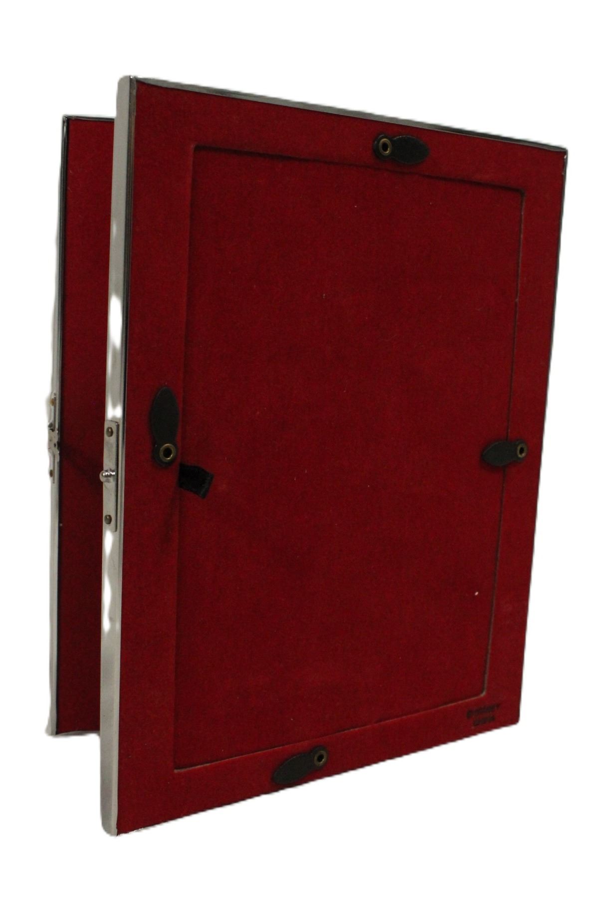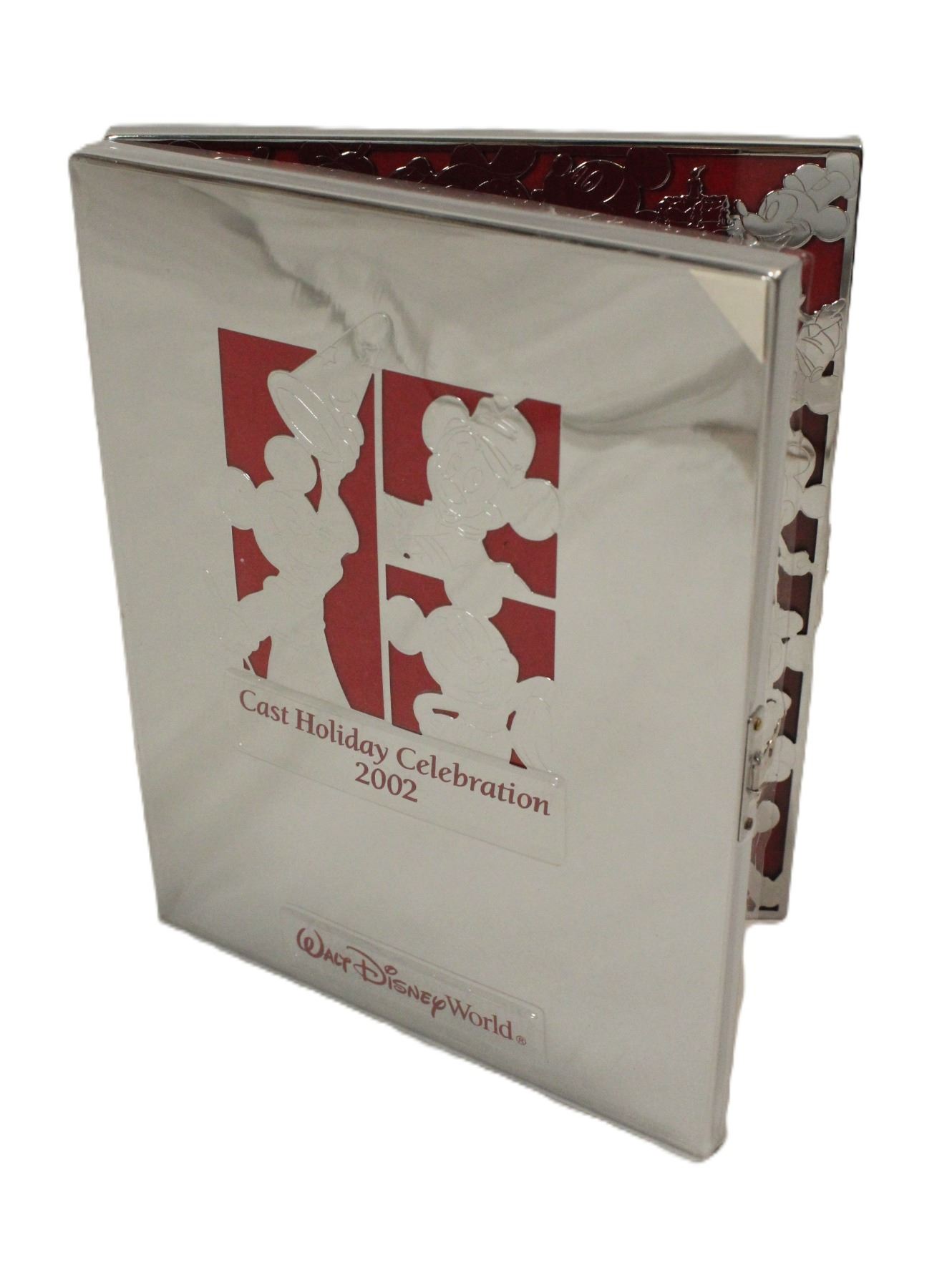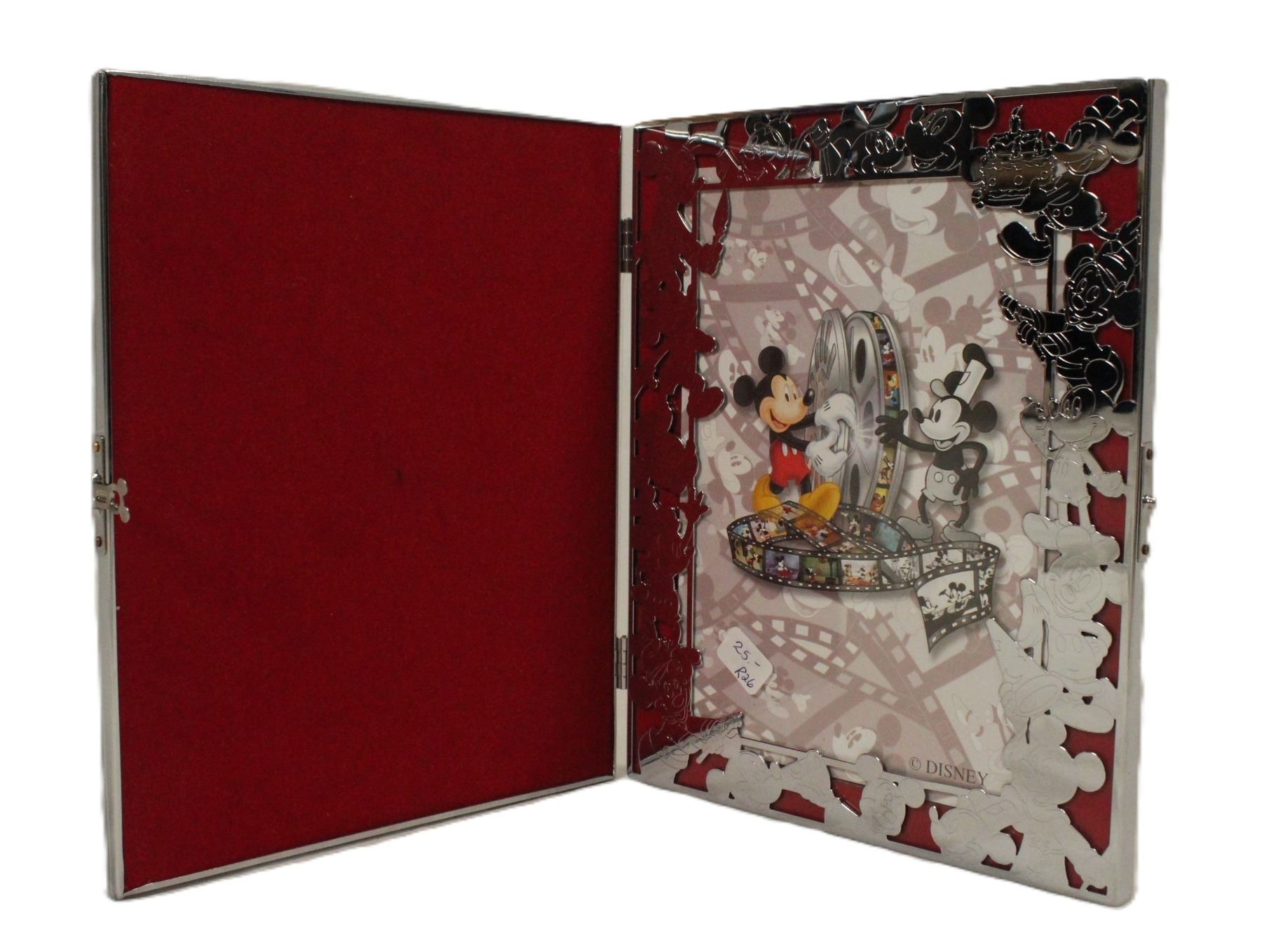 This photo frame is a high quality, silver colored metal photo frame. the cover features Three versions of Mickey Mouse with a red velvet background. The photo frame is hinged and features a Mickey Mouse head shaped button lock clasp. The inside of the photo frame features many versions of Mickey Mouse through the years surrounding the photo area with a red velvet background. The frame is new and unused with the protective covering still installed.