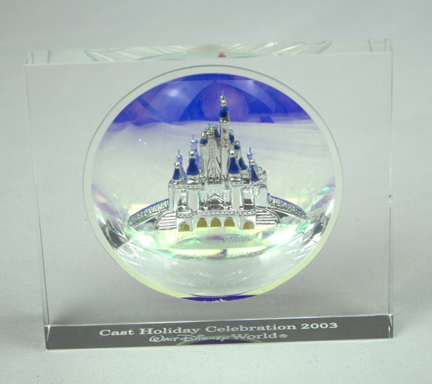 (Walt Disney World, 2003) This is a 2003 Cast Member Exclusive Cinderella Castle Castle Glass paperweight. It features Cinderella's Castle inside a mirrored acryllic dome with the phrase " Cast Holiday Celebration 2003 Walt Disney World". It is in like new condition and measures 4" W x 3.4" H x .75" W.