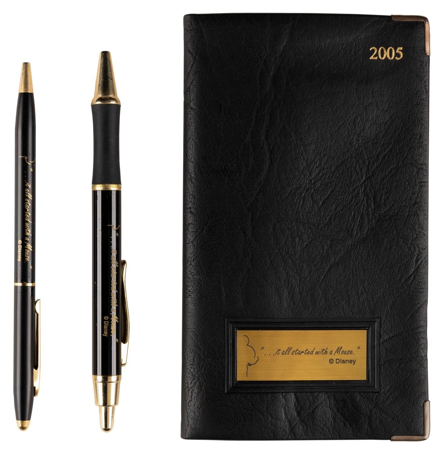 (Disneyland, 2005) A Cast Member almanac and a pair of pens commemorating the Park's 50th anniversary. Each is decorated with Walt Disney's famous quote "...it all started with a Mouse." Measuring 6" x 3.5" and 5.5" long, each piece is in very good condition with light handling wear, and the pens require new ink cartridges.