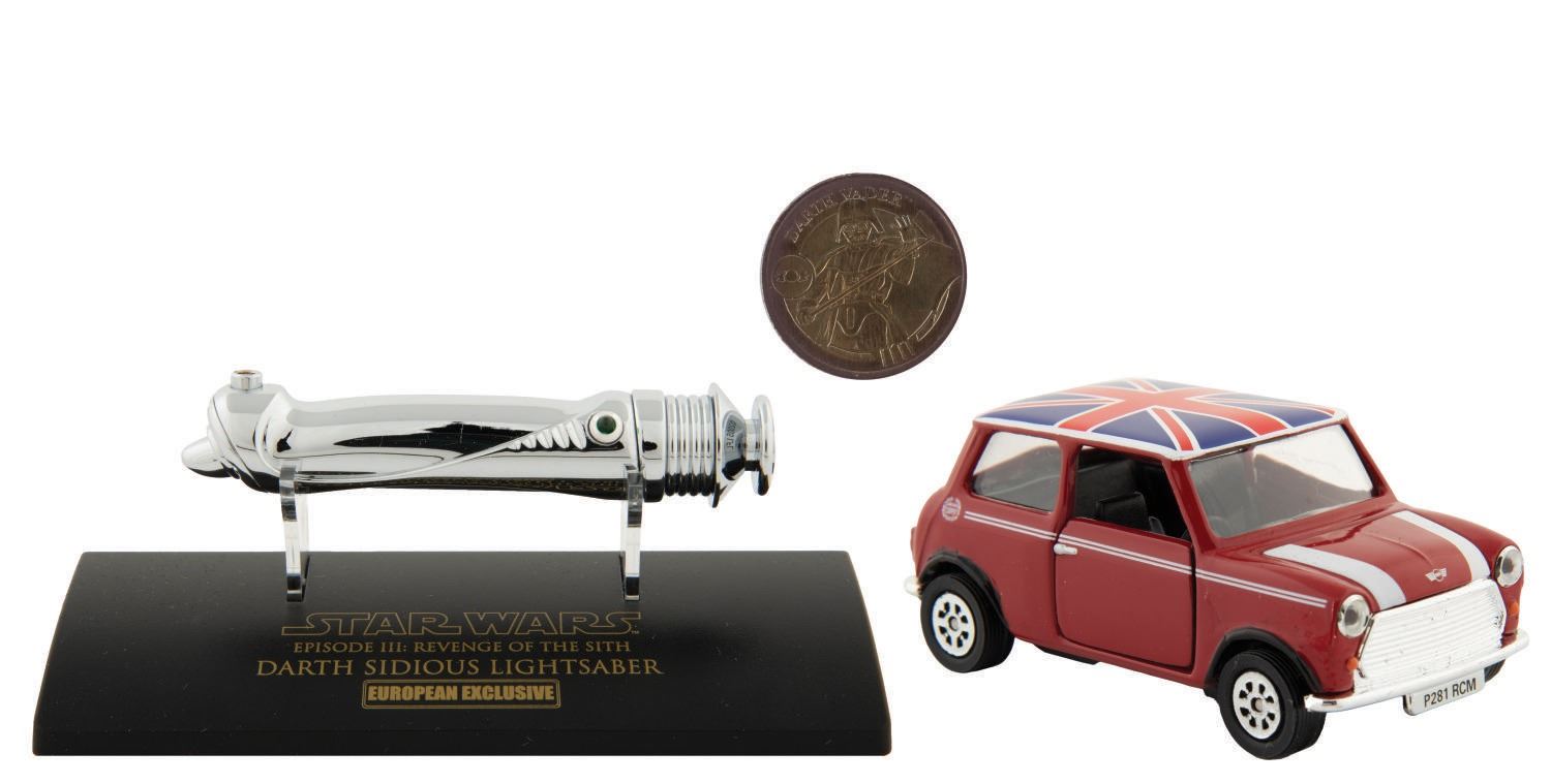 (Master Replicas/CORGI, 2007) A Limited Edition Master Replicas Mini Cooper, Coin, & Lightsaber Set produced as a commemorative gift for the 2007 Toy Fair. The set was produced in an edition size of 1000 pieces and features a Darth Sidious Lightsaber with a rare European Exclusive display stand, a 1/36 Mini Cooper, and commemorative coin. The set comes complete with 6.5"x6.25" and 6.5" deep box and is in fine condition, with little wear.