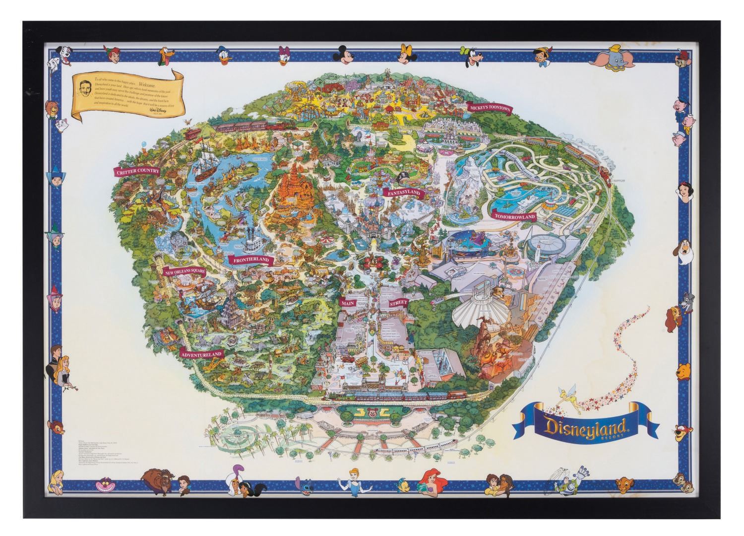(Disneyland, 2008) A large souvenir map of Disneyland from 2008. Designed by artist Nina Rae Vaughn, the map features a Disney character-studded border by Stephen Cargile and is the first edition to feature the Finding Nemo Submarine voyage attraction. Measuring 39"x27", the map is in very good condition with yellowing throughout, minor wear along original folds, and an area of mild discoloration in the right side from moisture exposure.