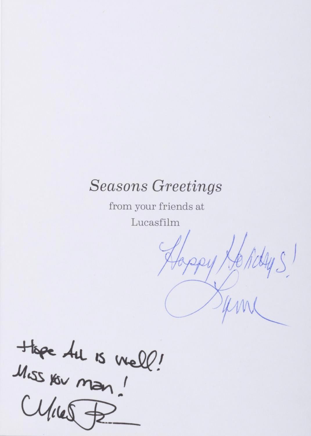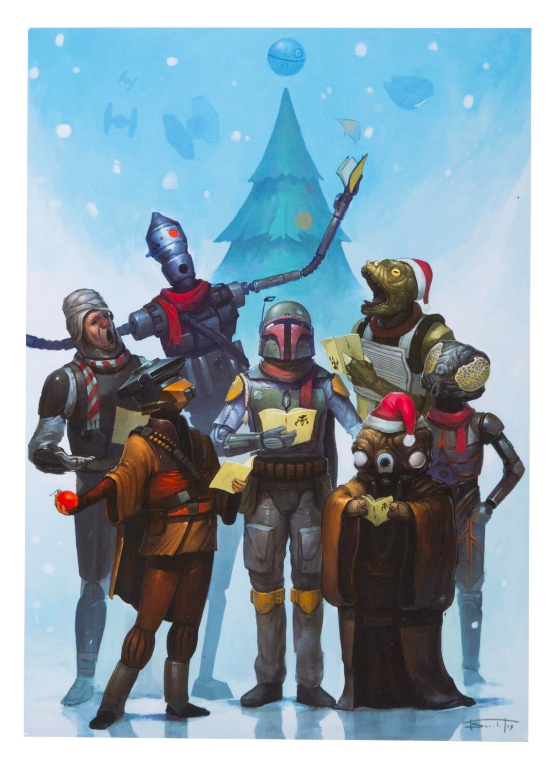 (Lucasfilm, 2013) The 2013 Lucasfilm Holiday card featuring caroling bounty hunters. Measuring 5” x 7”, the card is in very good condition with two dedications written inside.