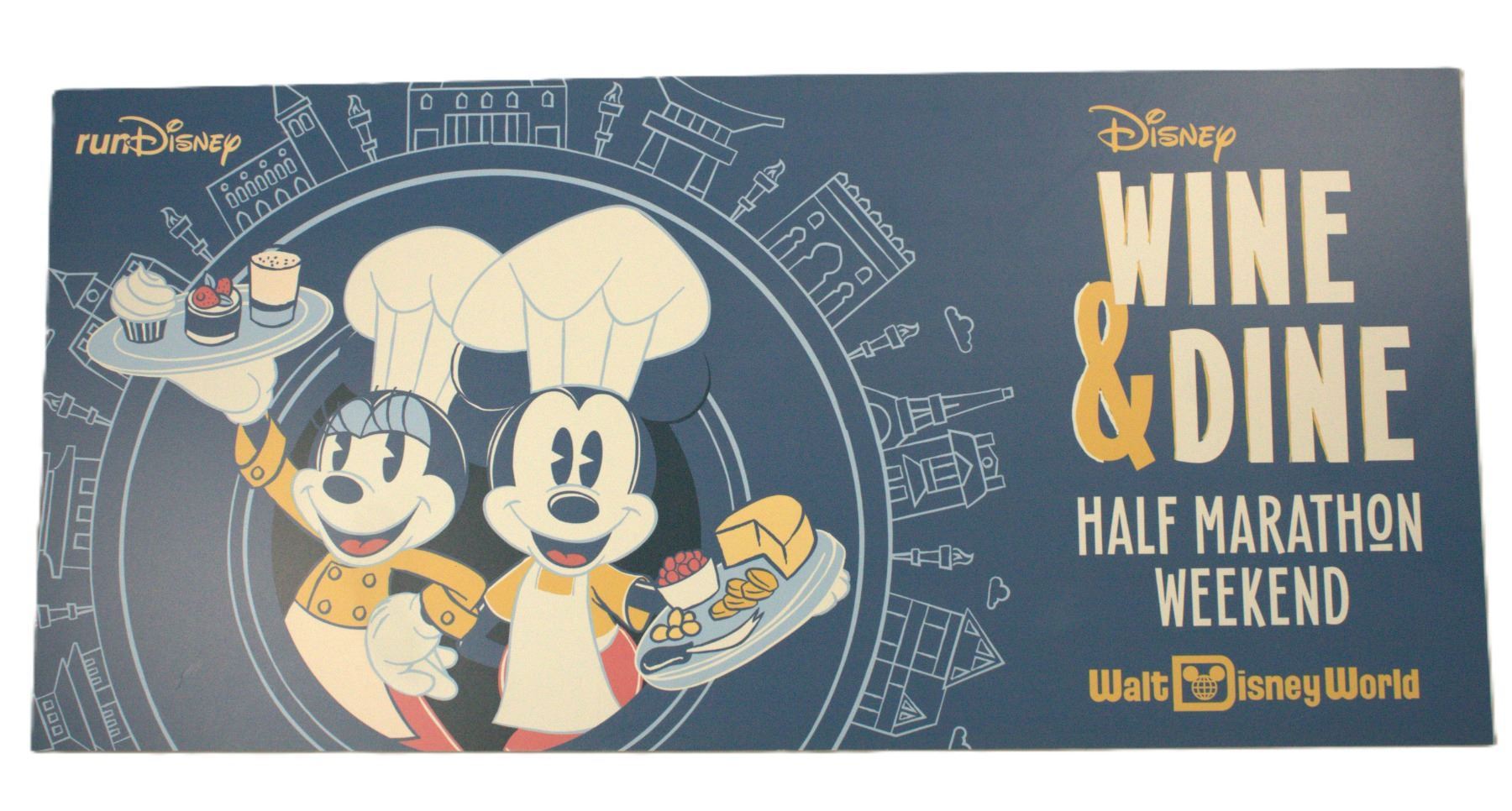 (Walt Disney World, 2024) This is a rare event sign from the 2024 runDisney Wine and Dine race event weekend. The sign features Mickey and Minnie Mouse with the event logo. This rigid plastic board sign measures 46.75" x 29". It was only available for purchase at the conclusion of the event and there are only a few just like it in existence.
