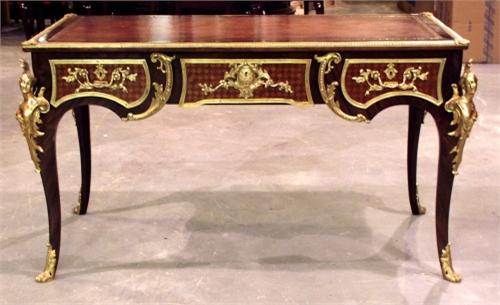 A 20th century bronze mounted fruitwood desk in the Louis XVI style. With marquetry inlay and embossed leather writing surface. 52 1/2" x 28".