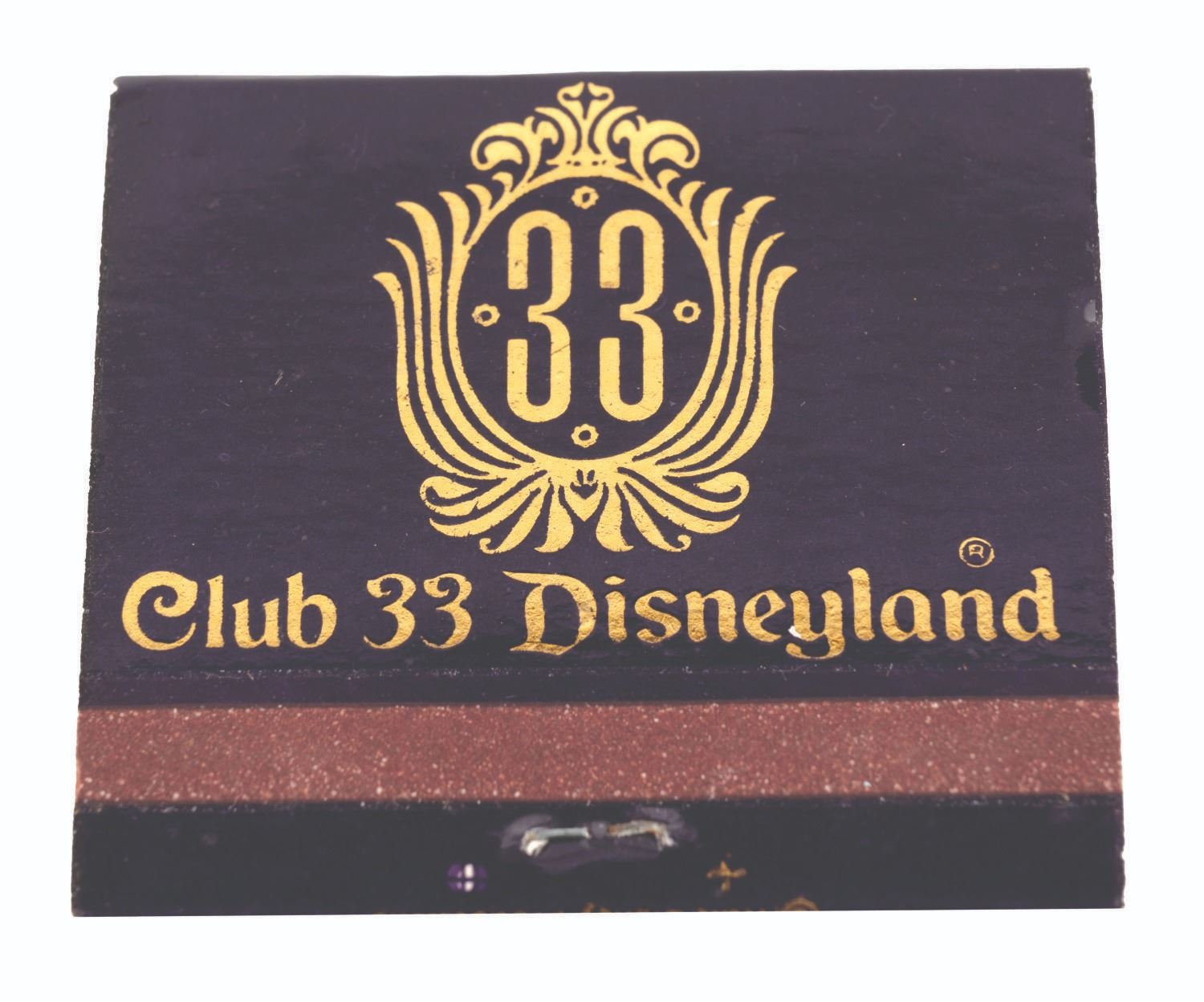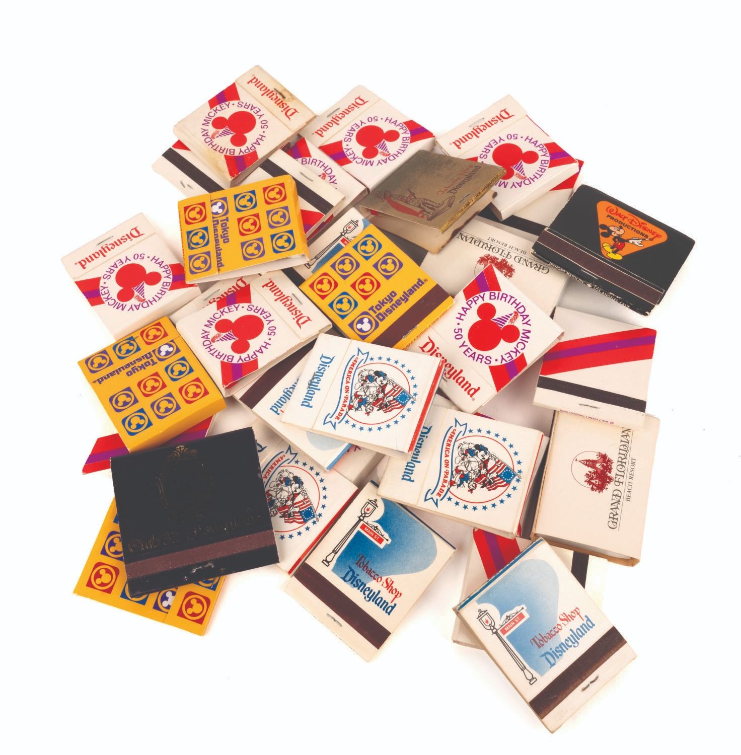 (Disney, 1970s-1980s) A large assortment of 34 matchbooks and matchboxes from the Disney Parks. Included are 17 Mickey's 50th Birthday, four Tokyo Disneyland, one Club 33, one Disneyland Tabacco Shop and one AOP Disneyland Tabacco Shop, one Walt Disney Productions, and one Grand Floridian. The matchbooks range in size from 2" x 1" and 2" x 2", and are in good to fine condition with light to average handling wear, with one of the Mickey's 50th matchbooks in fair condition with discoloration and staining throughout.