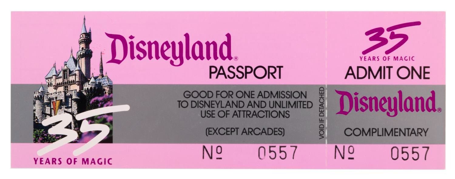 (Disneyland, 1990) An unused "35 Years of Magic" Complimentary Disneyland Passport from the Park’s 35th anniversary. The reverse has been stamped "VOID" and is not valid for admission to the Park. Measuring 2" x 5.5", the passport is in fine condition.