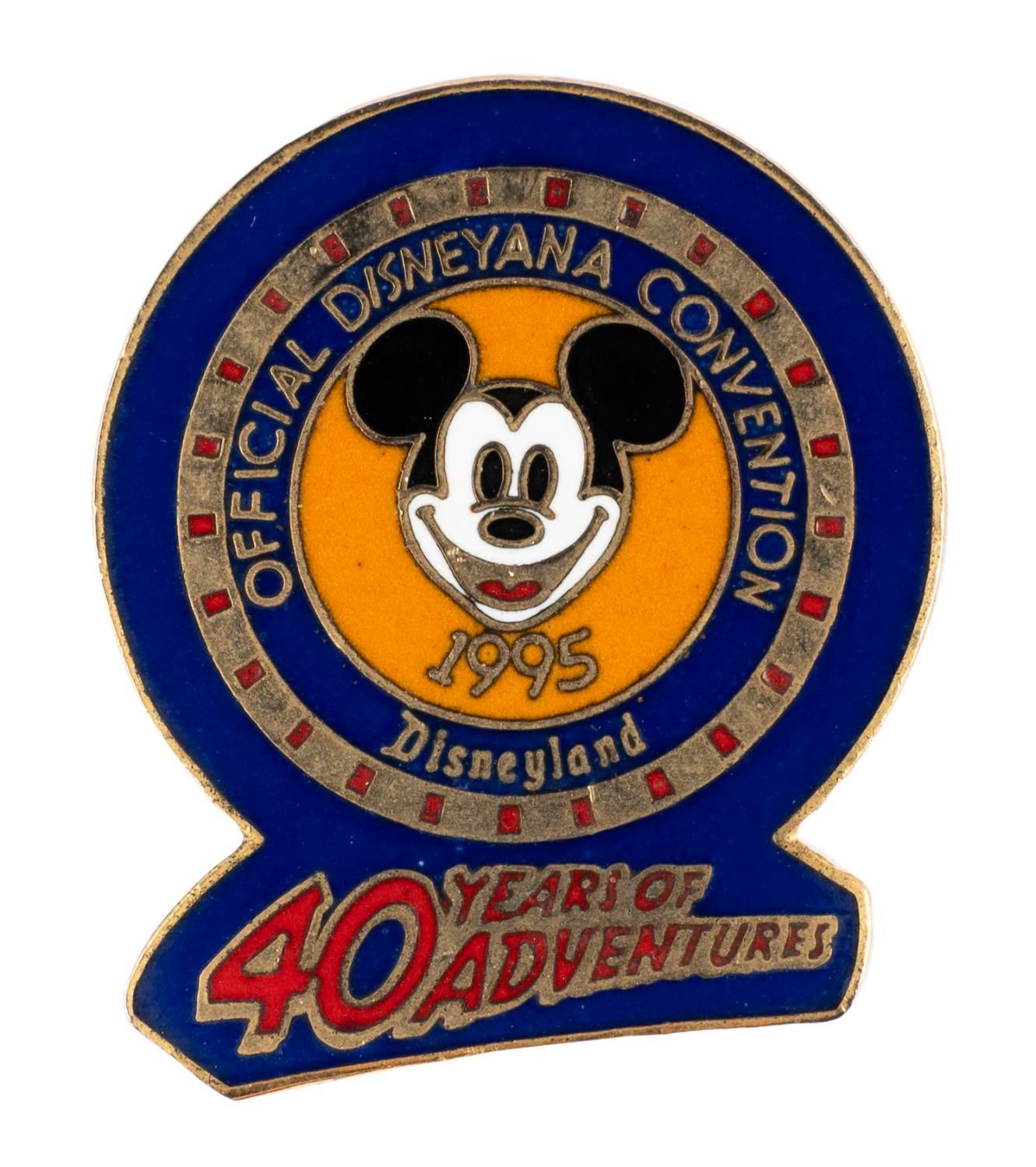 (Disneyana, 1995) A 40 Years of Adventure pin released at the Disneyana Convention in celebration of Disneyland's 40th anniversary. Measuring 1" x 1.25", the pin is in very good condition with light wear from age and use.