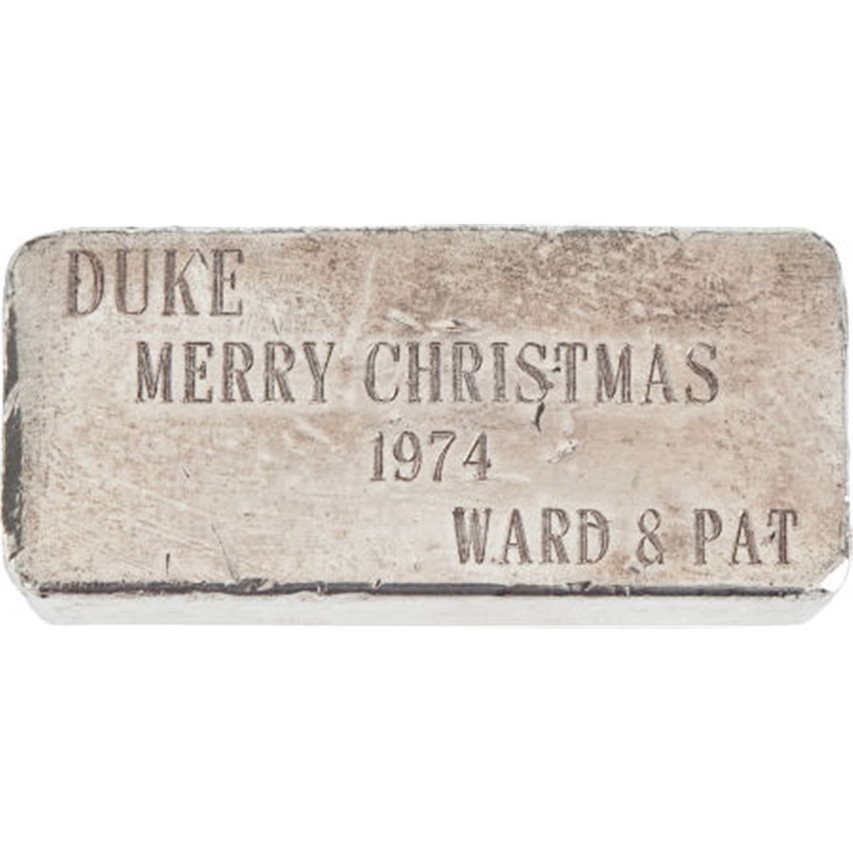 A 5-Ounce Sterling Silver Bar, 1974. Front engraved "5 oz Troy / 999 Fine," back engraved "Duke / Merry Christmas / 1974 / Ward & Pat."1" x 2" x 1/2"