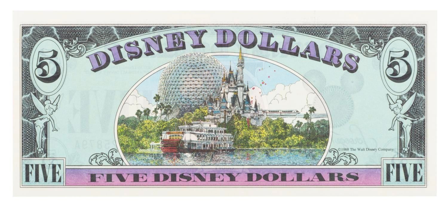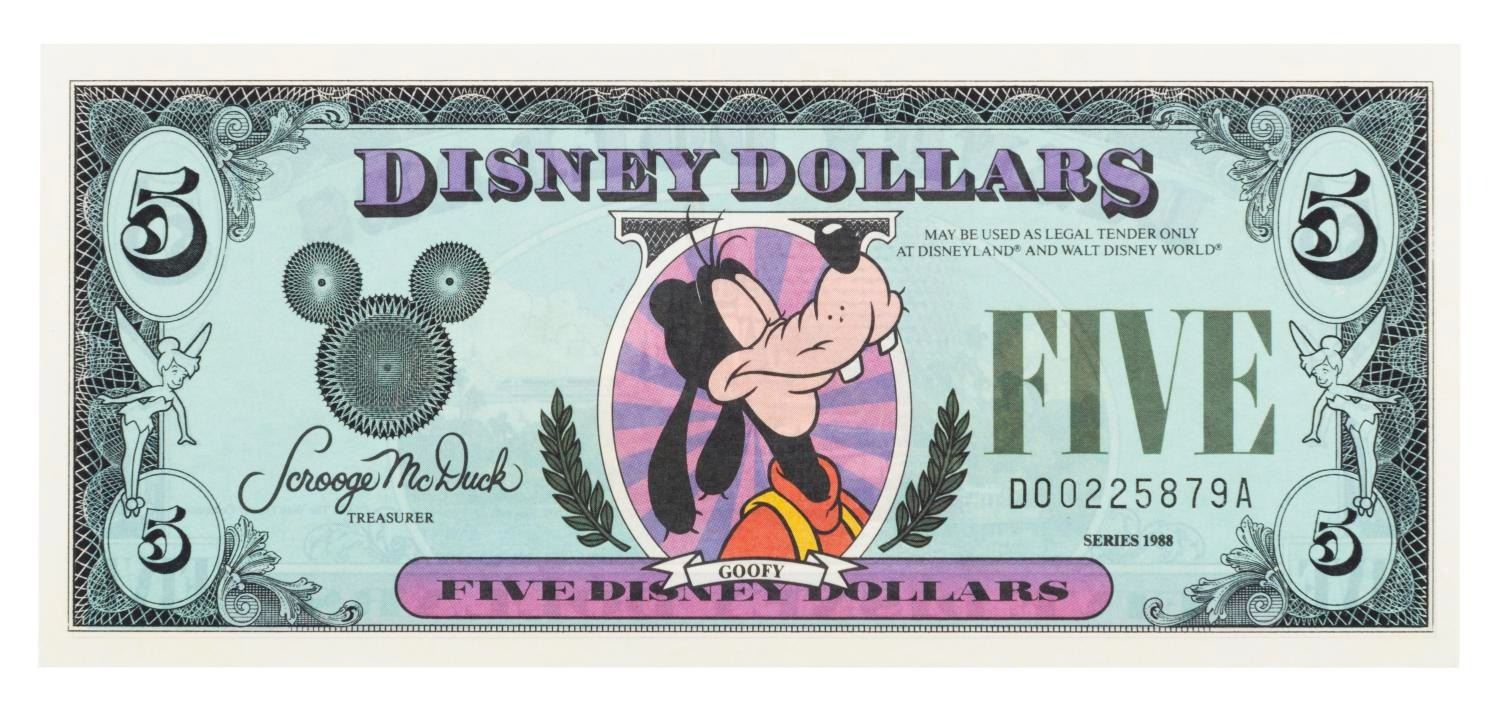 (Disney, 1988) A Goofy Disney Dollars $5 bill from Series 1988, numbered D00225879A. Measuring 2.75" x 6.25", the bill is in fine condition.
