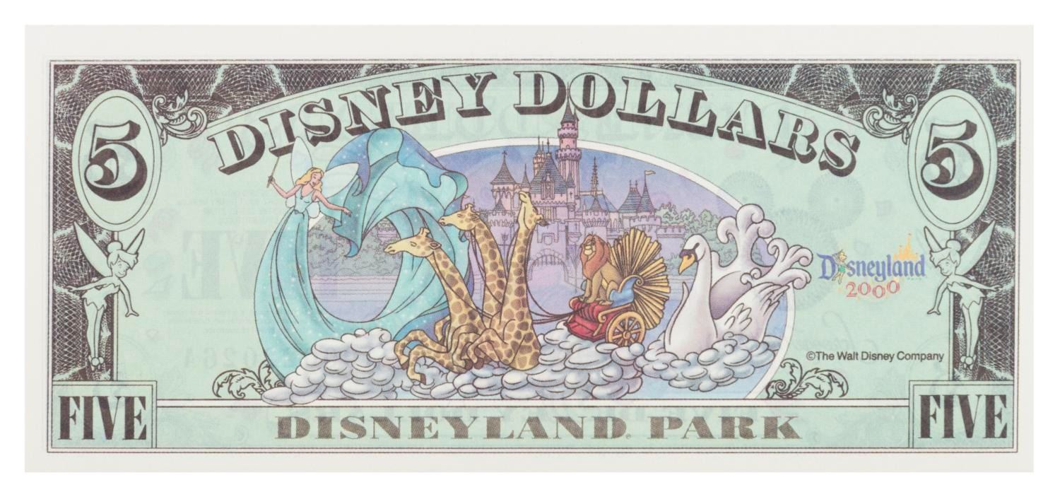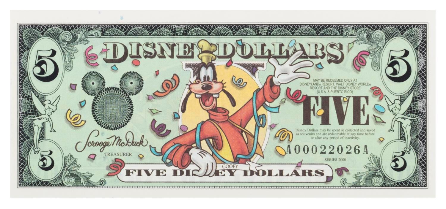 (Disney, 2000) A Goofy Disney Dollar $5 bill from Series 2000, numbered A00022026A. Measuring 2.75” x 6.25”, the bill is in fine condition.