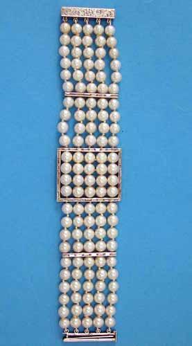 A 5-row uniform cultured pearl bracelet, the buckle design front and the 2 spacer bars set baguette cut diamonds, 7.25ins £700-900