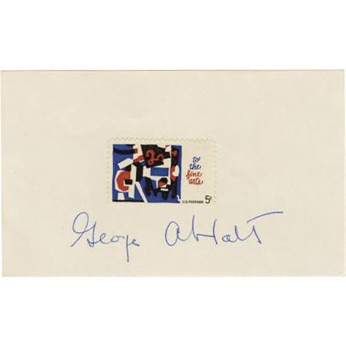 <B>George Abbott Autograph.</B></I> A 5" x 3" card, with a five-cent commemorative postage stamp affixed, signed by the celebrated film and theatre director/writer/producer in blue ink. Abbott's autograph extends across the base of the card and is large and clean. In Excellent condition though there is minor glue residue from album storage en verso (not affecting signature).<BR><BR><b>Shipping:</b> Flat Material, Small (<a target="_blank" href="http://www.heritageauctions.com/common/shipping.php">view shipping information</a>)