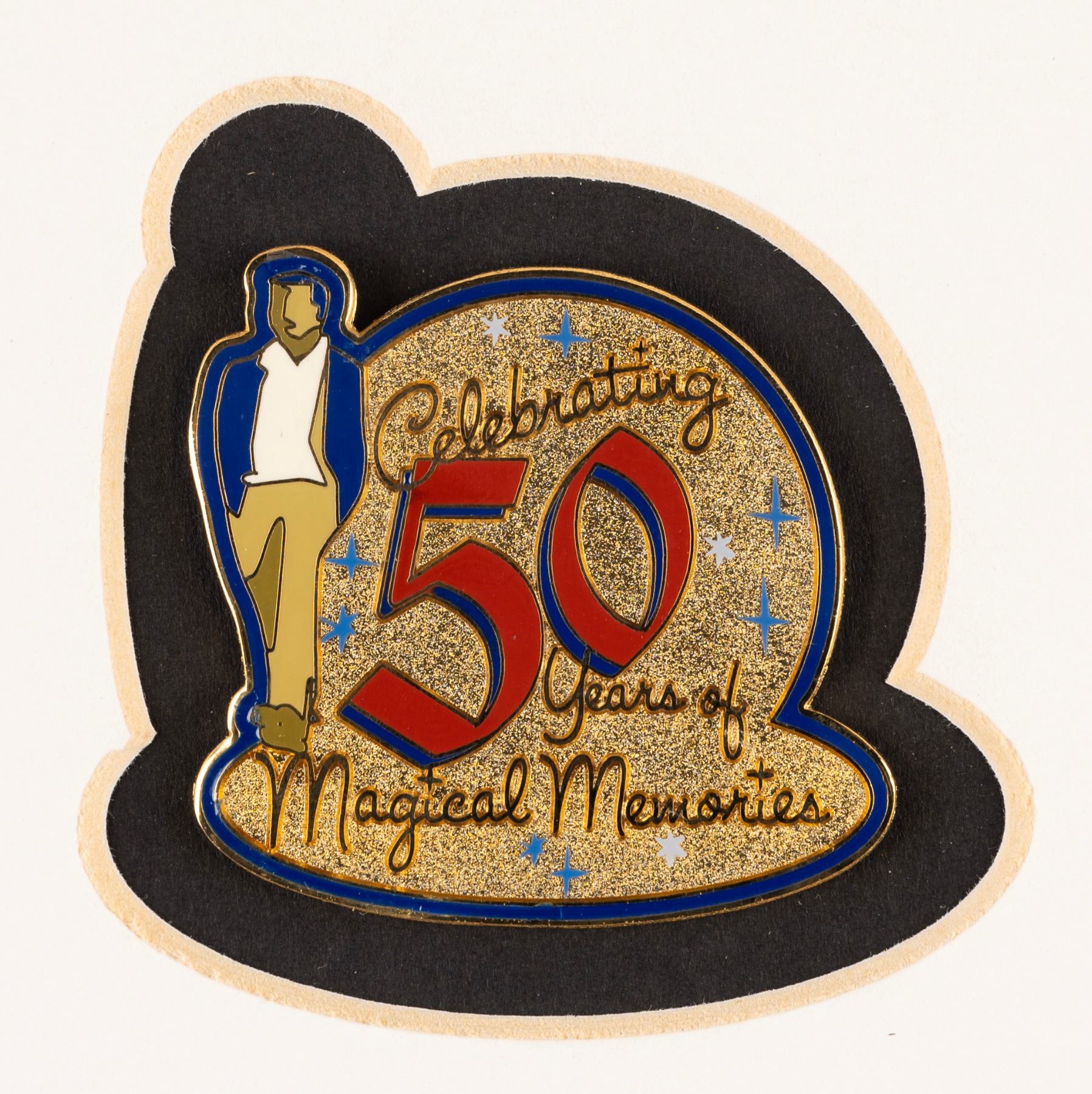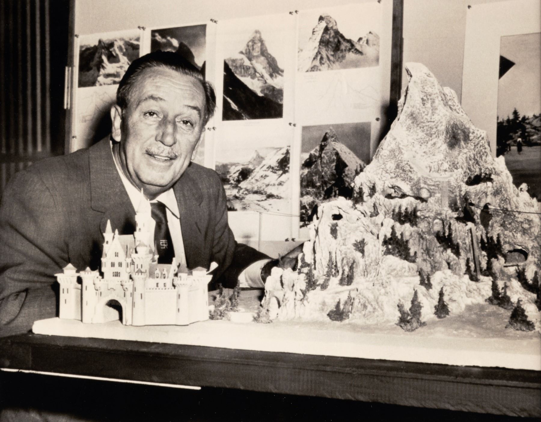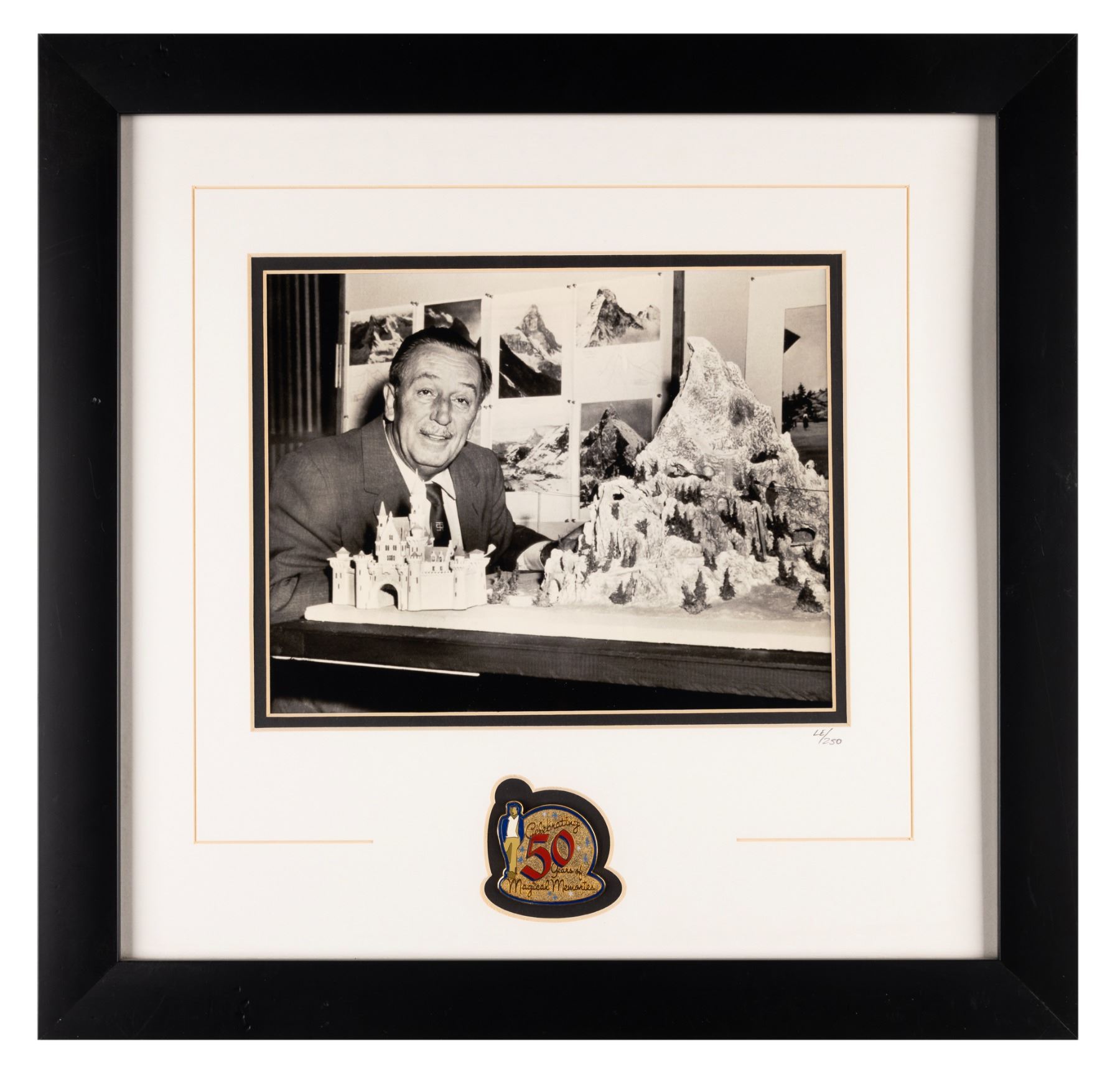 (Disneyland, 2005) A photograph of Walt Disney with models of Sleeping Beauty Castle and the Matterhorn, framed with a “Celebrating 50 Years of Magical Memories” pin. The set was released in a limited edition of only 250. The pin measures 1.75” x 1.75” and the photo displays 7.25” x 9.25” visible within a 17” x 16.5” matte and frame. The pin and photo are in fine condition, with light toning to the photo, and the frame in good condition with some wear from display.