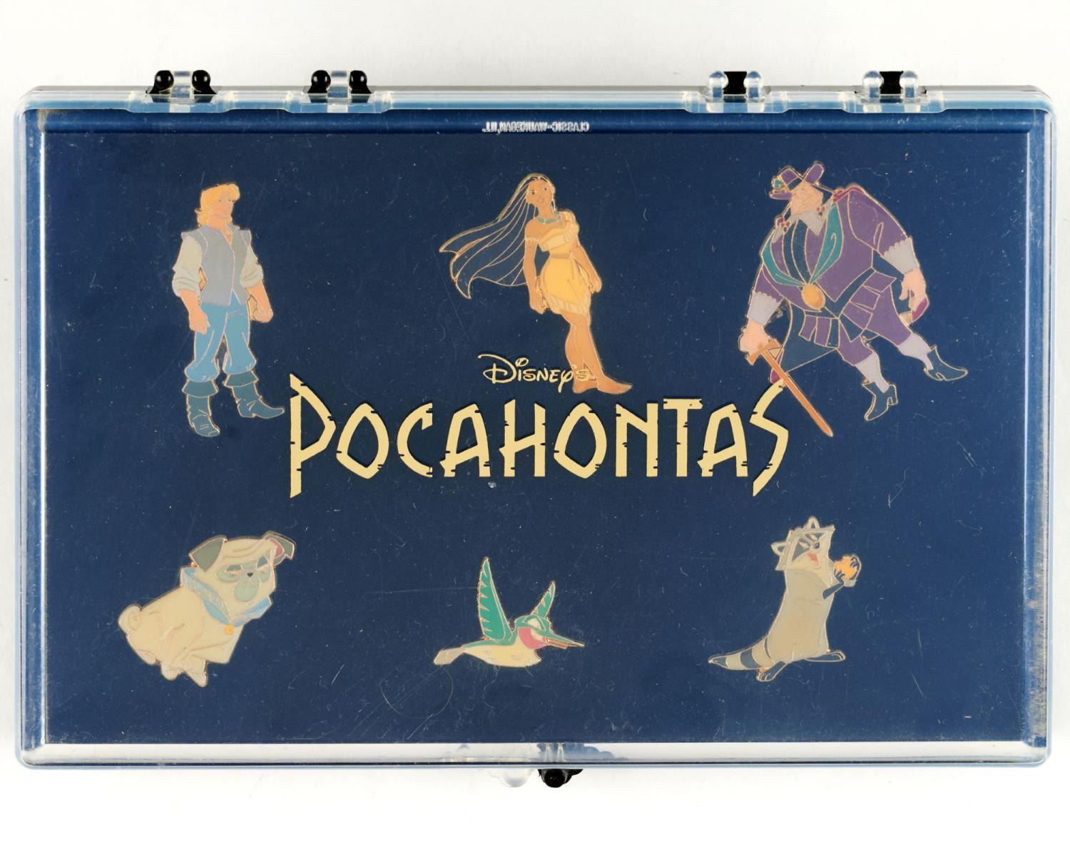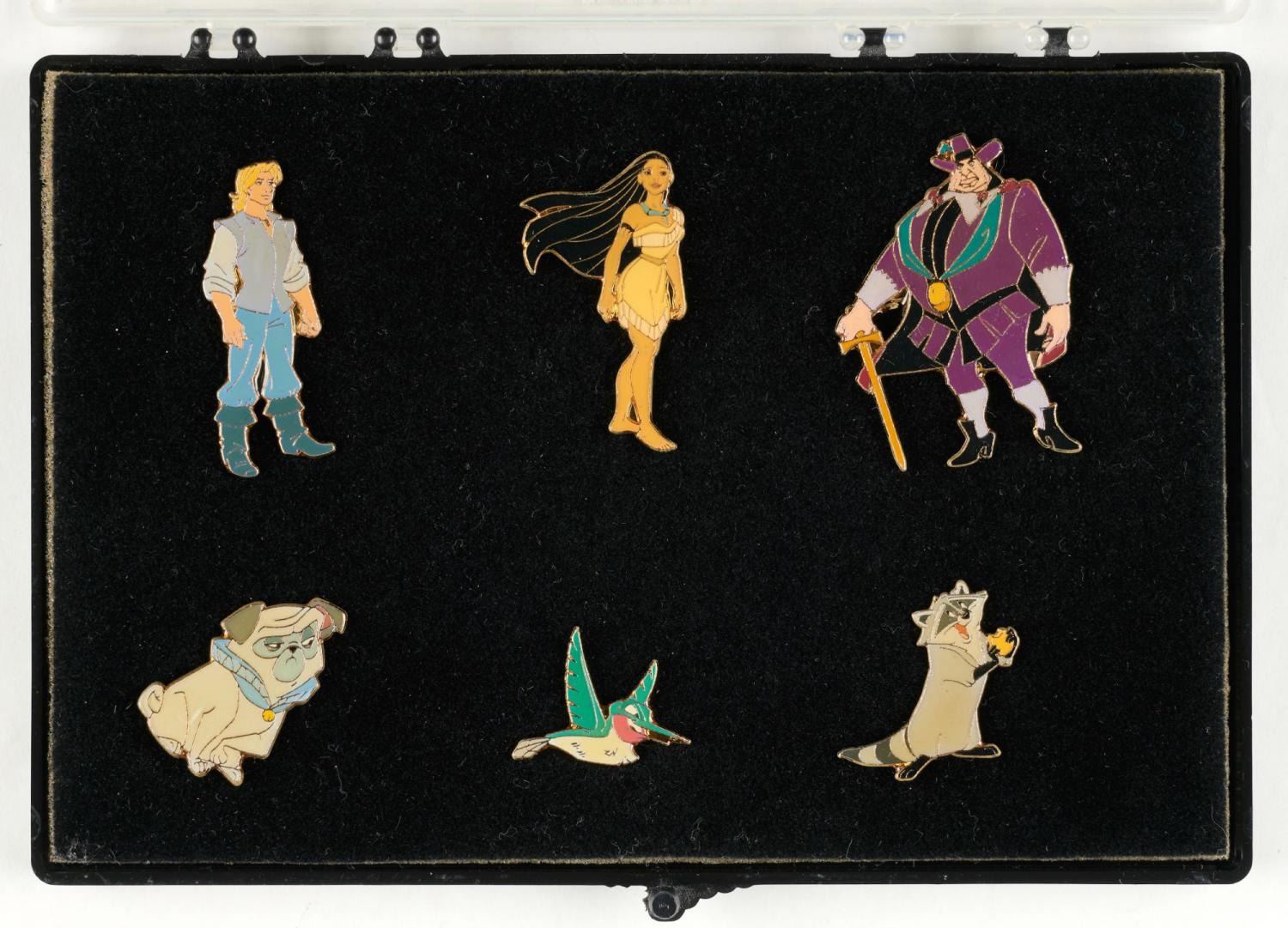 (Disney, 1995) A six-piece"Pocahontas" pin set featuring Pocahontas, John Smith, Meeko, Flit, Percy, and Governor Ratcliffe. The set was released at the Disney Store to coincide with the theatrical release of the film. Measuring approximately 1.5" x 1" each, the pins are in very good condition with typical light discoloration from age, with the good condition original plastic case, which displays light handling wear.