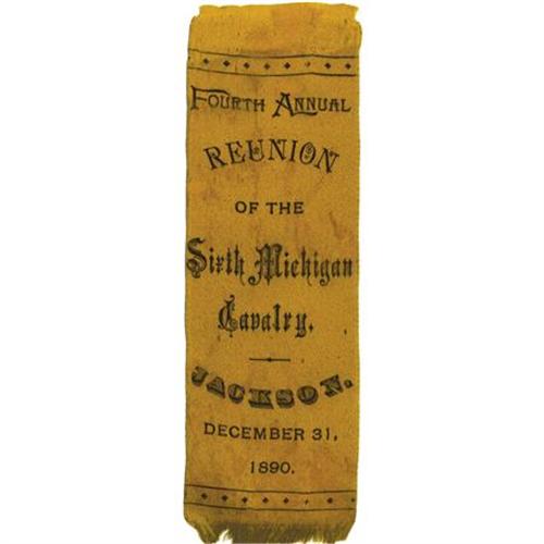 <B>A"6TH MICHIGAN CAVALRY" CUSTER BRIGADE G.A.R. REUNION RIBBON</B></I> - This yellow Grand Army of the Republic reunion ribbon is from the December 31, 1890 reunion of the Sixth Michigan Cavalry. With black print on the yellow background, the 'Fourth Annual Reunion' ribbons are a rarity. This one is in very good condition.<BR><BR><b>Shipping:</b> Miscellaneous Collectibles, Smal (<a target="_blank" href="http://www.heritageauctions.com/common/shipping.php">view shipping information</a>)