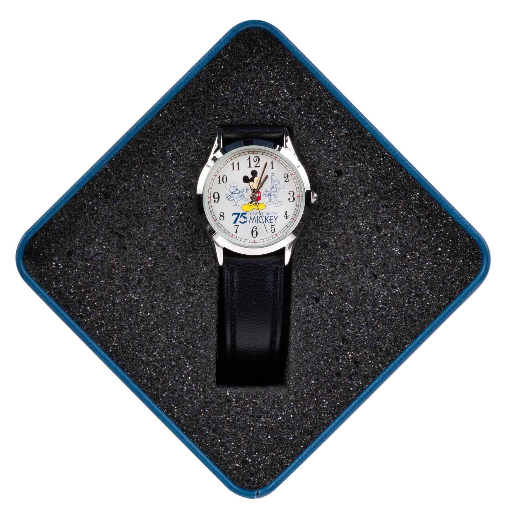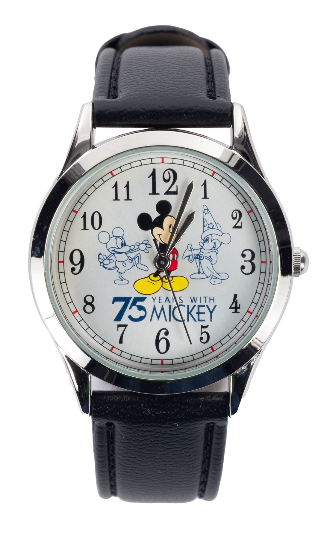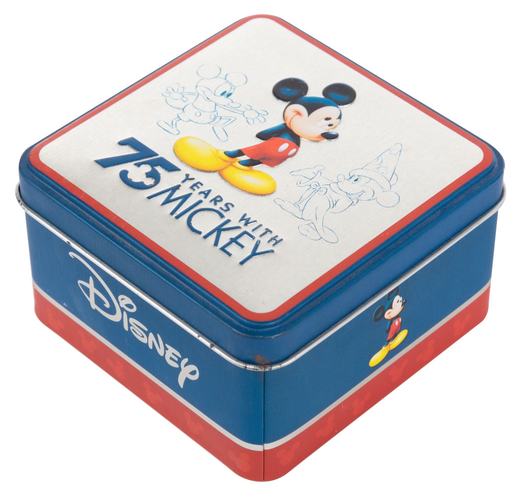 (Avon, 2004) A 75 Years With Mickey wristwatch featuring Mickey as he appeared in "Plane Crazy," "Fantasia," and in the present. Measuring 9", the watch is in fine as-new condition within its 3.75" x 3.75" and 2.25" deep commemorative tin.