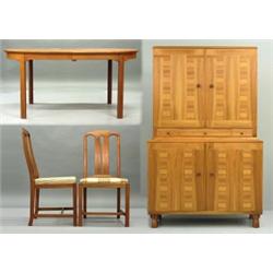 walnut, Carl Malmsten, "Ambassadör", manufactured by Åfors möbelfabrik, contains: cupboard, table, 6 chairs, 3 extra boards, size of table with extra boards: height 74 cm, 326 x 112 cm, size of cupboard: height 178 cm, 111 x 44 cm