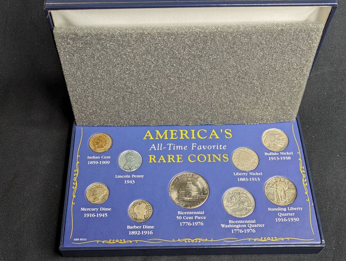 A 9 Piece American Coinage type Set Including a Indian Head Penny, Standing Liberty Quarter, Barber Dime, Mercury Dime and MORE!!! Includes original issue box.