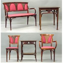 winerejugend, Josef & Jakob Kohn Austria, burned mark J&J. Kohn Taschen Austria, height of table 76 cm, 104 x 68 cm, length of sofa 113 cm; wear