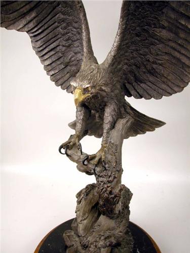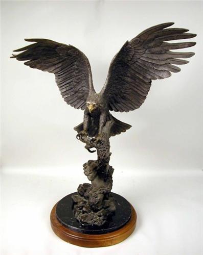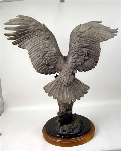 Titled "Freedom" by Steve Retzlaff, perched on a bronze branch, signed on back of branch Steve Retzlaff 47/50, with Certificate of Authenticity, edition 47/50, and silver content 634.370 ounces .999, engraved on one wing 634 T.O., on a turning circular marble and walnut base. Sculpture 34"h x 29"w.