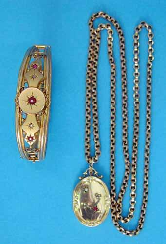 A 9ct gold (front and back) oval pendant locket, set with a ruby and seed pearls on 9ct gold chain and a 9ct gold hinged bangle, the openwork front gypsy set rubies and diamonds. £200-250