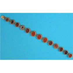 A 9k gold bracelet, of 13 graduated oval intaglio carved jasper and carnelian plaques mounted in rope twist frame, 7.25ins £750-850