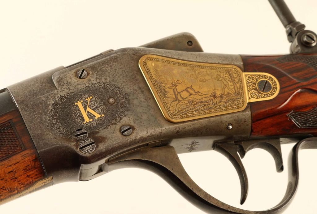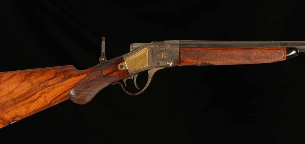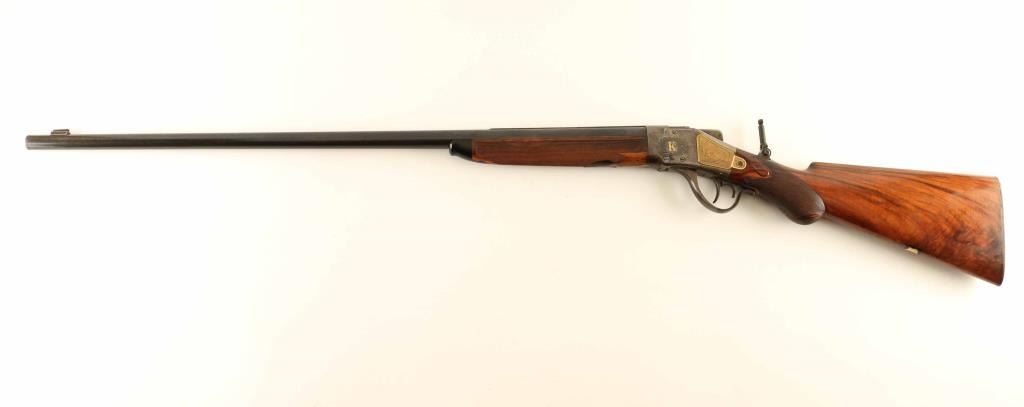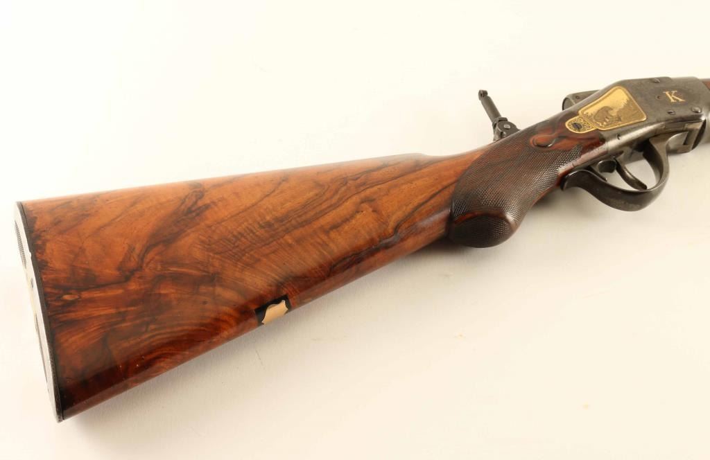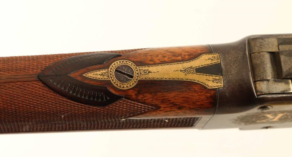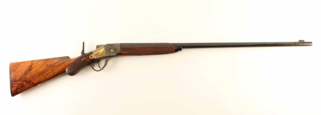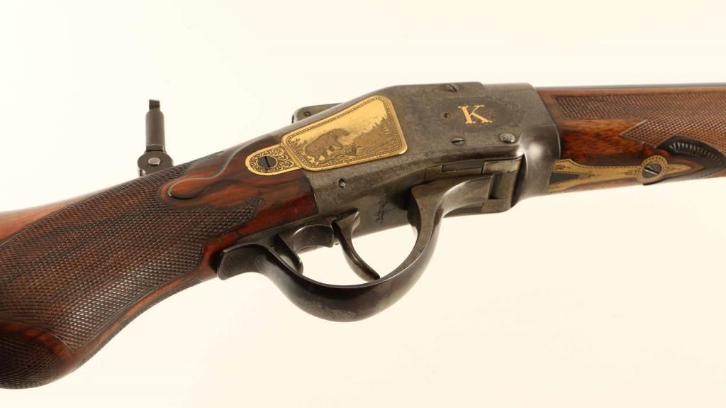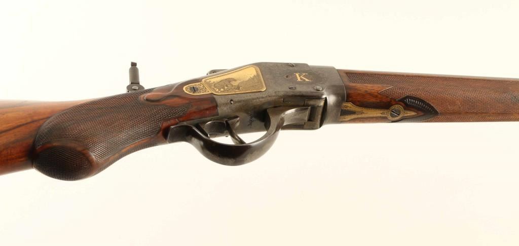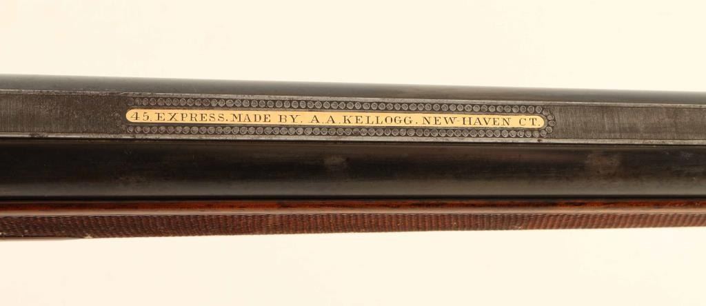 'Long Range Rifle' Deluxe embellished antique falling block single shot sporting rifle, manufactured circa 1870's-1880's. Produced by Alfred A. Kellogg, a New Haven, Conn. gunsmith well known for his customized Sharps Borchardt rifles. Kellogg guns are believed to be hand built, all of which have no serial numbers and many feature L.D. Nimschke engraving. Configuration: Blued 30" barrel with quarter rib marked "45. EXPRESS. MADE BY. A.A. KELLOGG. NEW HAVEN CT." in gold, blade front sight with gold bead, early Lyman No 1 tang mounted peep sight, case hardened receiver with large gold inlayed "K"s in 'AAK' monograms on the side surrounded by scroll, gold plated brass sideplates with engraved game/hunting scenes including a deer running from a hunter on the left & bear on a ledge on the right, knurled trigger, automatic safety, finely hand checkered fancy Circassian walnut forend with ebony cap & brass furniture, and pistol grip shoulder stock with inlayed gold shield escutcheon and knurled steel buttplate with brass trapdoor. This rifle is believed to be the same rifle offered by Theodore Dexter in his First October List, in 1960. It is photographed and listed as "CUSTOM SHARPS .45 CALIBRE EXPRESS RIFLE OR DE LUXE SPORTING MODEL. THIS CUSTOM BORCHARDT WELL KNOWN TO COLLECTORS AND ALSO RECOGNIZED IN THE SHARPS FILES. TOP OF RIGBY TYPE BARREL FLAT IS INGRAVED AND INLAYED IN HEAVY GOLD "45 EXPRESS. A. A. KELLOG, NEW HAVEN, CONN." 30" ROUND BBL. THE MOST BEAUTIFUL CIRCASSIAN WALNUT PISTOL GRIP STOCK I HAVE EVER SEEN ON A GUN. ACTION ARTISTICALLY ENGRAVED AND ON BOTH SIDES A LARGE "K" INLAYED IN GOLD. THE SIDE PANELS ARE MEDAL HEAVILY OVERLAYED WITH GOLD AND ENGRAVED AND INLAYED WITH GOLD GAME SCENES. RIGHT SIDE A LARGE GRIZZLY BEAR ON A LEDGE. LEFT SIDE A DEER RUNNING THROUGH THE TREES. FOREARM ARTISTICALLY CAPPED WITH HORN. UNDERSIDE OF THE FOREARM INLAYED WITH GOLD ESCUTCHEON BEAUTIFULLY ENGRAVED. GOLD NAME PLATE IN STOCK. THE METAL BUTT-PLATE IS A WORK OF ART WITH ARTISTIC GOLD TRAP DOOR, FINELY ENGRAVED. THE GUN HAS REAR PEEP ON TANG WITH ELONGATED RAISED RAMP FRONT BEAD. THIS ARM MUST BE SEEN TO BE EVEN GUESSED AT IN ITS STATELY BEAUTY OF DESIGN AND ARTISTIC ORNAMENTATION. MADE SPECIAL FOR A ROCKY MOUNTAIN HUNT. FINEST POSSIBLE CONDITION AND ALL ORIGINAL----$2250.00". Includes an article published in the Sharps Collector Association Report Vol. 17 No. 3 issue by Richard J. Labowskie regarding the guns listed by Dexter in 1960 as well as a copy of the listing itself with photos. Barrel retains a small amount of thinned bluing with the majority of the surfaces displaying a mottled aged grey patina. The receiver shows traces of case colors with the balance comprised of bare metal & speckled dark oxidation. Action is sound, the bore is excellent and the wood stocks are very good with some small blemishes. Condition is NRA Very Good to Fine ***Antique Firearm*** [From the Jim Wilkinson Rifle Ranch Collection]