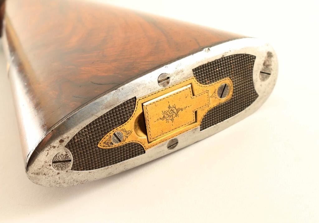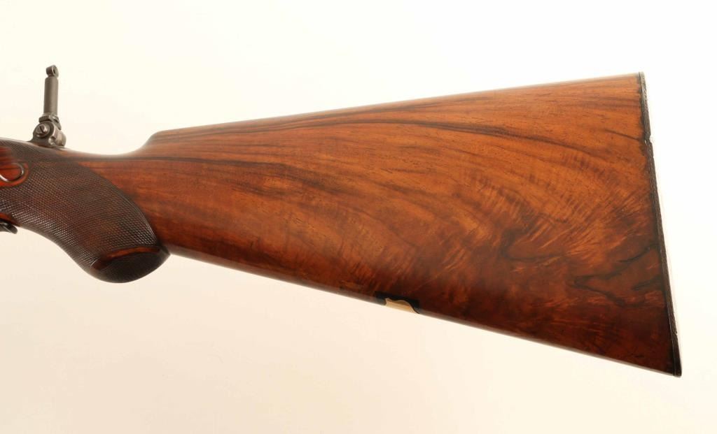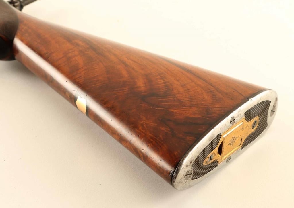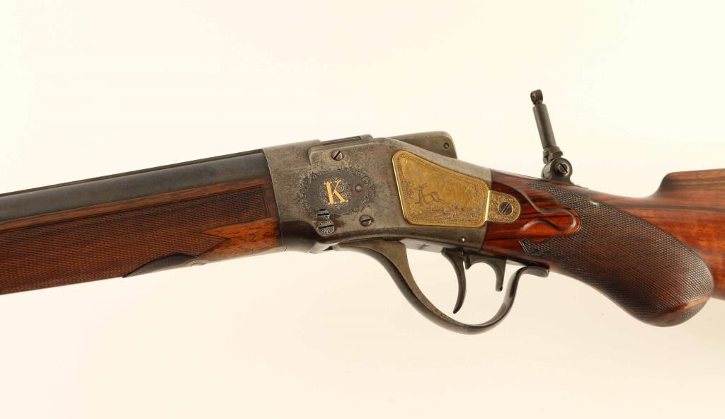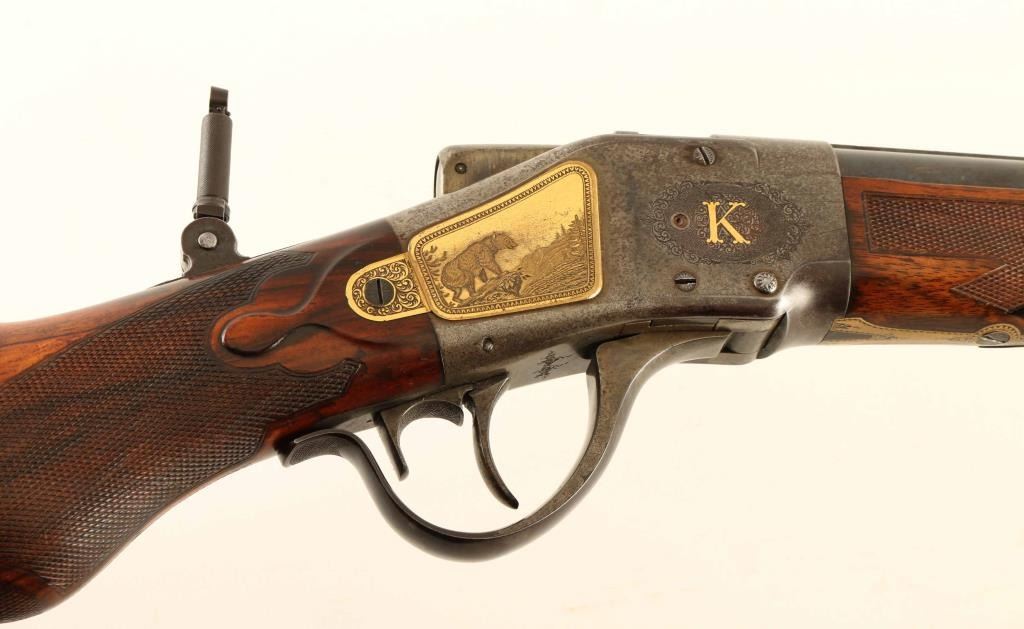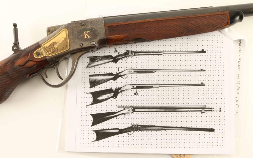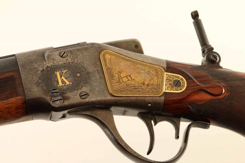 'Long Range Rifle' Deluxe embellished antique falling block single shot sporting rifle, manufactured circa 1870's-1880's. Produced by Alfred A. Kellogg, a New Haven, Conn. gunsmith well known for his customized Sharps Borchardt rifles. Kellogg guns are believed to be hand built, all of which have no serial numbers and many feature L.D. Nimschke engraving. Configuration: Blued 30" barrel with quarter rib marked "45. EXPRESS. MADE BY. A.A. KELLOGG. NEW HAVEN CT." in gold, blade front sight with gold bead, early Lyman No 1 tang mounted peep sight, case hardened receiver with large gold inlayed "K"s in 'AAK' monograms on the side surrounded by scroll, gold plated brass sideplates with engraved game/hunting scenes including a deer running from a hunter on the left & bear on a ledge on the right, knurled trigger, automatic safety, finely hand checkered fancy Circassian walnut forend with ebony cap & brass furniture, and pistol grip shoulder stock with inlayed gold shield escutcheon and knurled steel buttplate with brass trapdoor. This rifle is believed to be the same rifle offered by Theodore Dexter in his First October List, in 1960. It is photographed and listed as "CUSTOM SHARPS .45 CALIBRE EXPRESS RIFLE OR DE LUXE SPORTING MODEL. THIS CUSTOM BORCHARDT WELL KNOWN TO COLLECTORS AND ALSO RECOGNIZED IN THE SHARPS FILES. TOP OF RIGBY TYPE BARREL FLAT IS INGRAVED AND INLAYED IN HEAVY GOLD "45 EXPRESS. A. A. KELLOG, NEW HAVEN, CONN." 30" ROUND BBL. THE MOST BEAUTIFUL CIRCASSIAN WALNUT PISTOL GRIP STOCK I HAVE EVER SEEN ON A GUN. ACTION ARTISTICALLY ENGRAVED AND ON BOTH SIDES A LARGE "K" INLAYED IN GOLD. THE SIDE PANELS ARE MEDAL HEAVILY OVERLAYED WITH GOLD AND ENGRAVED AND INLAYED WITH GOLD GAME SCENES. RIGHT SIDE A LARGE GRIZZLY BEAR ON A LEDGE. LEFT SIDE A DEER RUNNING THROUGH THE TREES. FOREARM ARTISTICALLY CAPPED WITH HORN. UNDERSIDE OF THE FOREARM INLAYED WITH GOLD ESCUTCHEON BEAUTIFULLY ENGRAVED. GOLD NAME PLATE IN STOCK. THE METAL BUTT-PLATE IS A WORK OF ART WITH ARTISTIC GOLD TRAP DOOR, FINELY ENGRAVED. THE GUN HAS REAR PEEP ON TANG WITH ELONGATED RAISED RAMP FRONT BEAD. THIS ARM MUST BE SEEN TO BE EVEN GUESSED AT IN ITS STATELY BEAUTY OF DESIGN AND ARTISTIC ORNAMENTATION. MADE SPECIAL FOR A ROCKY MOUNTAIN HUNT. FINEST POSSIBLE CONDITION AND ALL ORIGINAL----$2250.00". Includes an article published in the Sharps Collector Association Report Vol. 17 No. 3 issue by Richard J. Labowskie regarding the guns listed by Dexter in 1960 as well as a copy of the listing itself with photos. Barrel retains a small amount of thinned bluing with the majority of the surfaces displaying a mottled aged grey patina. The receiver shows traces of case colors with the balance comprised of bare metal & speckled dark oxidation. Action is sound, the bore is excellent and the wood stocks are very good with some small blemishes. Condition is NRA Very Good to Fine ***Antique Firearm*** [From the Jim Wilkinson Rifle Ranch Collection]