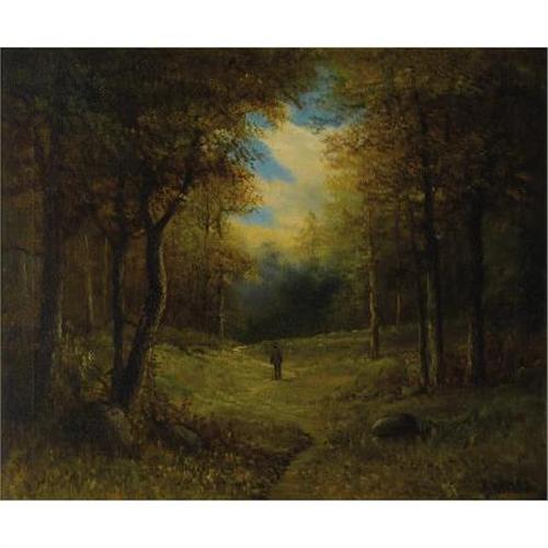 <B>A. A. MILLS (British, Mid-19th Century)</B></I><BR><I>Man Strolling in a Wooded Landscape</B></I><BR>Oil on canvas<BR>20 x 24 inches (50.8 x 61.0 cm)<BR>Signed lower right <I>A.A. Mills </B></I><BR> <B>Condition Report:</B> Original unlined canvas with one canvas patch verso supporting an area of restoration. Otherwise, paint surface is in excellent condition.<BR><BR><b>Shipping:</b> Framed - without Glass, Large (<a target="_blank" href="http://www.heritageauctions.com/common/shipping.php">view shipping information</a>)