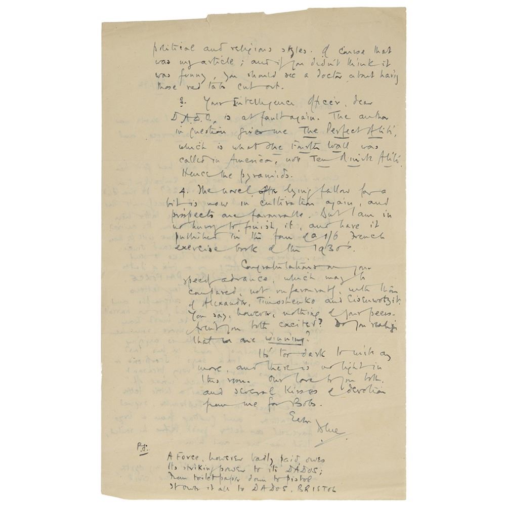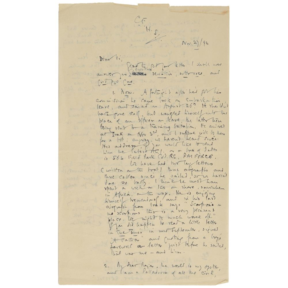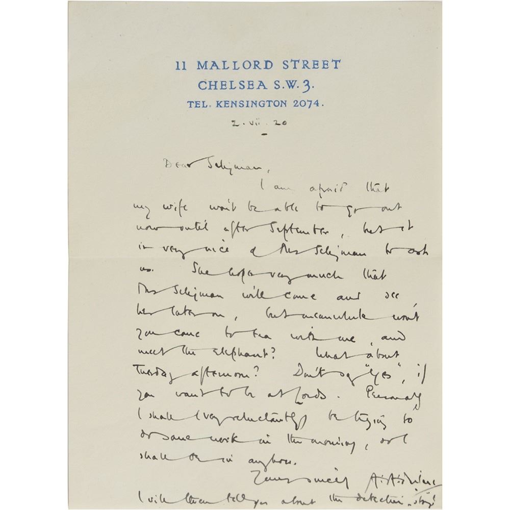 Two ALSs, signed "Blue" and "A. A Milne," three pages in total, dated July 2, 1920, and November 27, 1942. Both letters are addressed to close friend Vincent Seligman. The earlier letter, penned on Mallord Street letterhead, in part: "I am afraid that my wife won't be able to go out now until after September, but it is very nice of Mrs. Seligman to ask us. She hopes very much that Mrs. Seligman will come and see her later on, but meanwhile won't you come to tea with me, and meet the elephant? What about Tuesday afternoon?" The second letter, with Milne adding "C. F, H. S.," for Cotchford Farm, Hartfield, Sussex, in part: "I shall now answer your questions…1. Moon. A fortnight after he'd got his commission he came back on embarkation leave, and sailed on August 26th. He shouldn't have gone really but wrangled himself into the place of an officer on leave…he arrives at Irak on Nov 3rd, and I suppose will be there for a bit: anyway, we haven't heard since…2. My dear major, the world is my oyster, and I am Palladium of all the civil, political and religious styles. Of course that was my article; and if you didn't think it was funny, you should see a doctor about having those red tabs cut out…3. Your intelligence officer, dear D. A. D. O., is at fault again. The author in question gives me The Perfect Alibi, which is what The Fourth Wall was called in America…Hence the pyramids. 4. The novel after lying fallow for a bit is now in cultivation again, and prospects are farmable." Milne adds a short poem for a postscript, "A force, however badly paid, owes / its striking power to its DADOS; / from toilet paper down to pistol / it owes it all to DADOS Bristol." In overall fine condition, with creasing to the top of one of the letters.