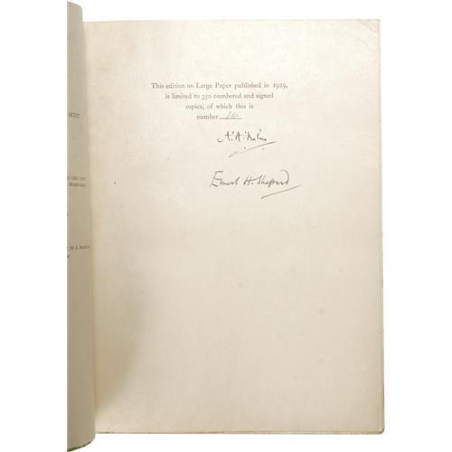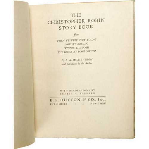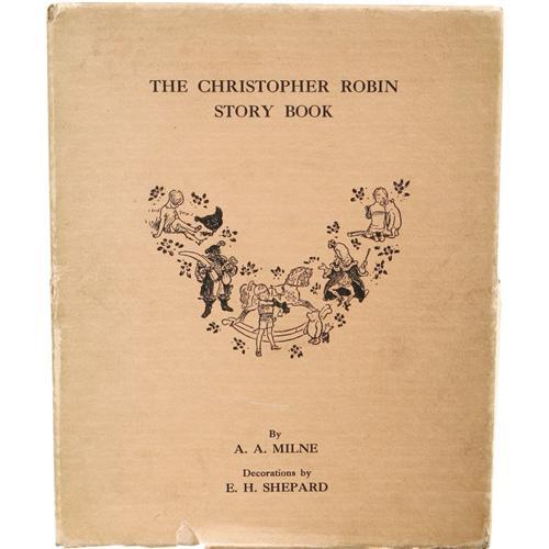 <B>A. A. Milne Limited Signed:<I> The Christopher Robin Story Book.</B></I></B></I> (New York: E. P. Dutton & Company, 1929), number 14 of 350 large paper copies, signed by the author and illustrator on a limitation page bound in front, 168 pages, illustrated by E. H. Sheppard, original green half silk over orange paper boards, paper spine label with black titles, untrimmed edges, original acetate protector present, 8vo (7.25" x 9"), a beautiful copy in the publisher's original matching pictorial box that is toned about the edges and has suffered some separation and damage at the edges.<BR><BR><b>Shipping:</b> Books & Catalogs (<a target="_blank" href="http://www.heritageauctions.com/common/shipping.php">view shipping information</a>)