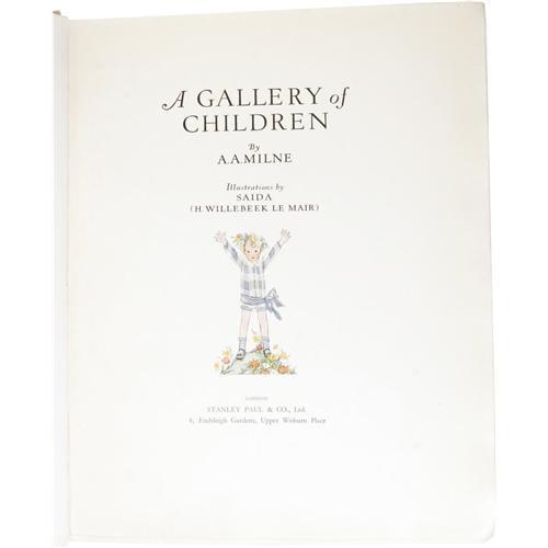 <B>A.A. Milne Limited Signed: <I>A Gallery of Children</B></I></B></I> with illustrations by H. Willebeek Le Mair. (London: Stanley Paul and Company, 1925). Limited edition, number 243 of 500, large 4to, (10.25" x 12.75"), 105pp., gilt-pictorial cream cloth; top edges gilt, others uncut. Of the 12 full color plates, one has a small tear at top ("Miss Waterlow in bed"), and a missing plate ("Castles by the sea") has been replaced with a color facsimile. Signed by Milne on the limitation page. With foxing to endpages, otherwise clean and very good condition.<BR><BR><b>Shipping:</b> Books & Catalogs (<a target="_blank" href="http://www.heritageauctions.com/common/shipping.php">view shipping information</a>)