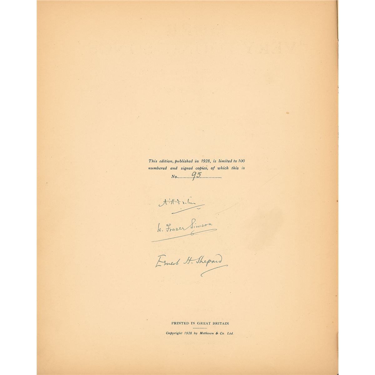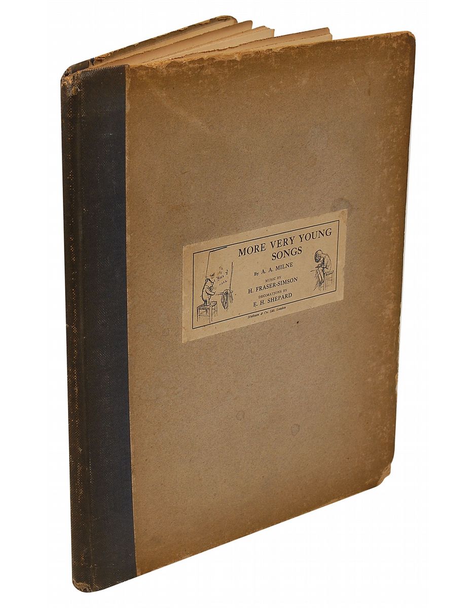 Signed book: More Very Young Songs. First edition, limited issue numbered 95/100. London: Methuen & Co., Ltd., 1928. Hardcover, 10.25 x 13, 40 pages. Signed on the colophon in black ink, “A. A. Milne,” “Ernest H. Shepard,” and “H. Fraser-Simson.” Book features sheet music and lyrics to ten songs for children. Autographic condition: fine, with mild toning to signed page. Book condition: G-/None. Paper-covered boards with black cloth-covered spine, paper title affixed to front; significant wear to edges, with chips and tears to entirety; darkened, rubbed, and soiled; textblock halfway detached from covers with a 6.5” split in front hinge and full splits to several other hinges; several gatherings held on by a thread (some pages entirely detached); previous seller’s tiny sticker to front pastedown; previous owner’s inscription to ffep. Despite its condition, this book is quite a treasure, beautifully decorated throughout with early illustrations of Winnie-the-Pooh, Piglet, and Christopher Robin, among other subjects. A wonderful, rarely seen piece.