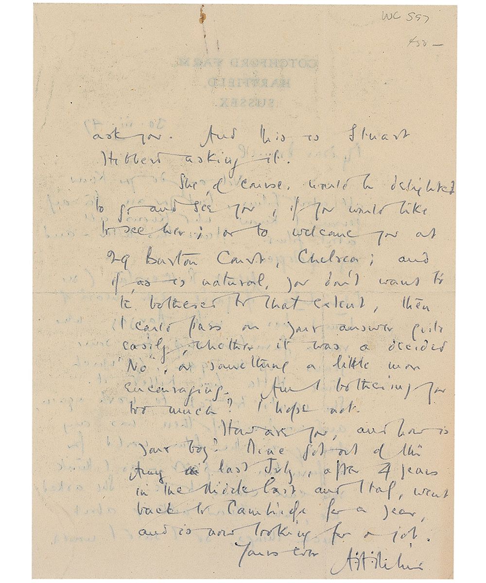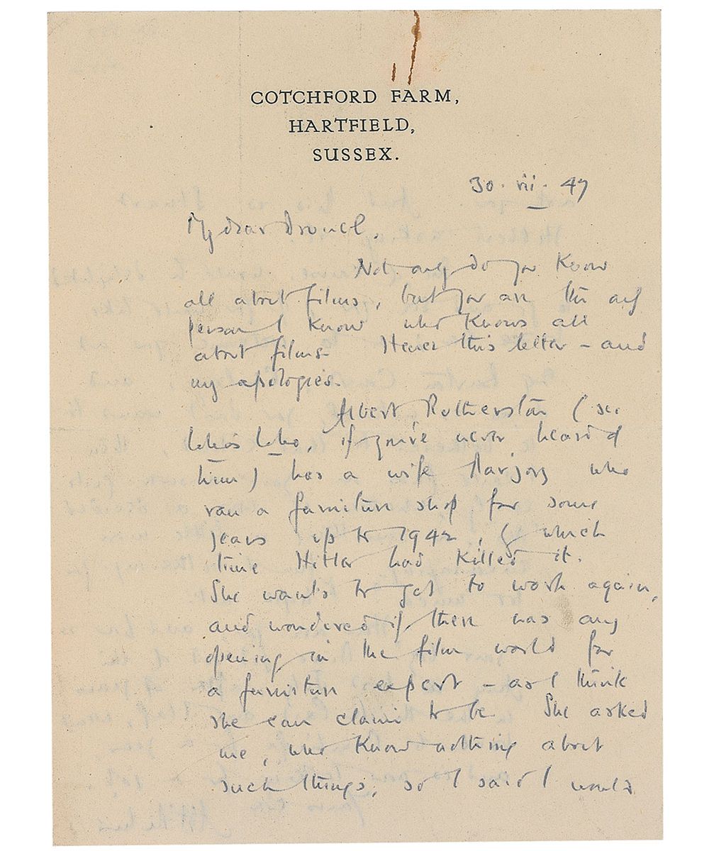 ALS, one page both sides, 5 x 6.75, Cotchford Farm letterhead, 1949. Letter to a gentleman. In part: “Not only do you know all about films, but you are the only person I know who knows all about films…Albert Rutherston (see Who’s Who, if you’ve never heard of him) has a wife Marjory who ran a furniture shop for some years up to 1942, by which time Hitler had killed it. She wants to get to work again, and wondered if there was any opening in the film world for a furniture expert—as I think she can claim to be. She asked me, who knows nothing about such things, so I said I would ask you…I could pass on your answer quite easily, whether it was a decided ‘no,’ or something a little more encouraging…How are you, and how is your boy? Mine got out of the Army last July, after 4 years in the Middle East and Italy, went back to Cambridge for a year, and is now looking for a job.” A rusty paperclip mark to the upper border and a few mild creases, otherwise fine condition. The Rutherston he mentions was a painter and illustrator. His son, Christopher Robin, upon whom the Pooh character was based, he wanted to join the military when WWII broke out but failed the medical exam; the elder Milne used his influence to secure him a position with the second training battalion of the Royal Engineers.
