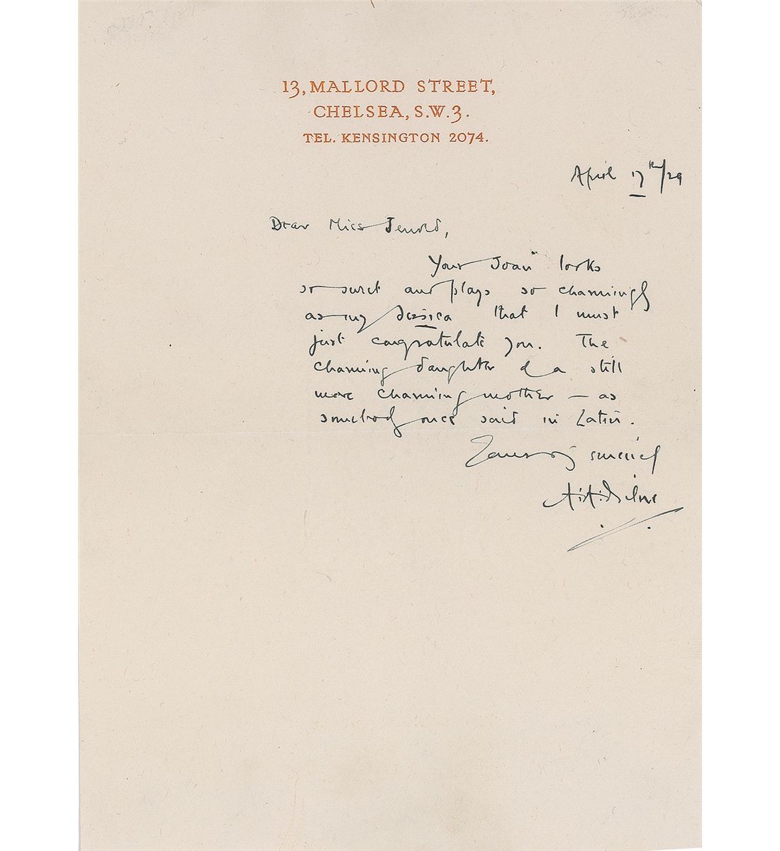 British author (1882–1956) who, despite a large body of novels, plays, and other ‘adult’ writings, will forever be most closely associated with his much-beloved series of Winnie-the-Pooh stories. ALS, one page, 5.5 x 7.5, personal letterhead, April 7, 1929. Letter to well-known actress Mary Jerrold. In full: “Your Joan looks so sweet and plays so charmingly as my Jessica that I just must congratulate you. The charming daughter of a still more charming mother—as somebody once said in Latin.” In fine condition. Accompanied by the original transmittal envelope.
