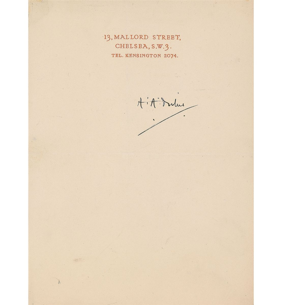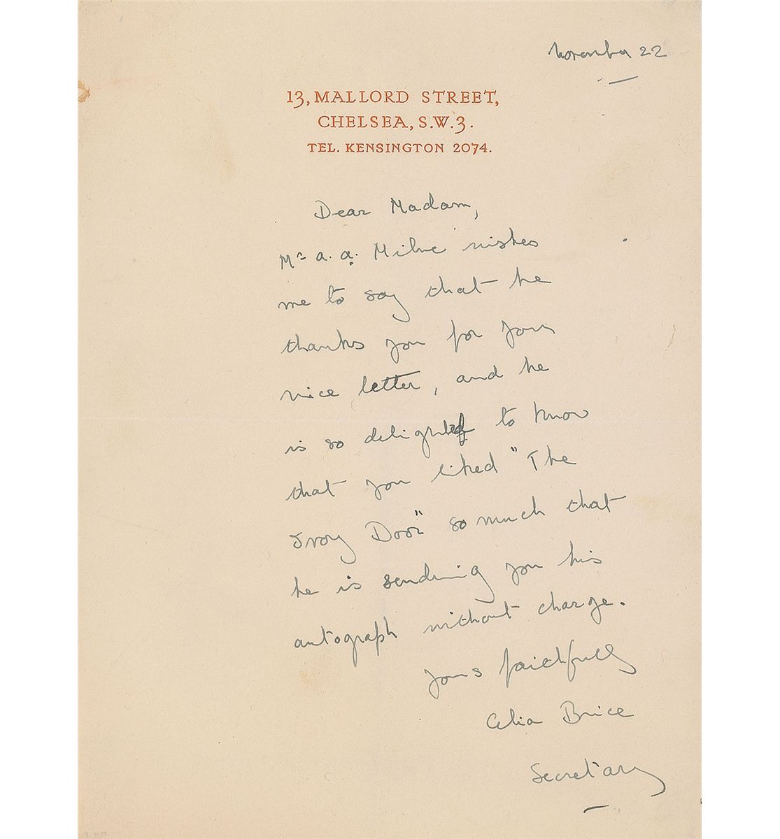 Fountain pen signature, “A. A. Milne,” on an off-white 5.5 x 7.5 sheet of personal stationery. In fine condition, with central vertical and horizontal folds and a few creases. Accompanied by a handwritten letter of transmittal from his secretary.