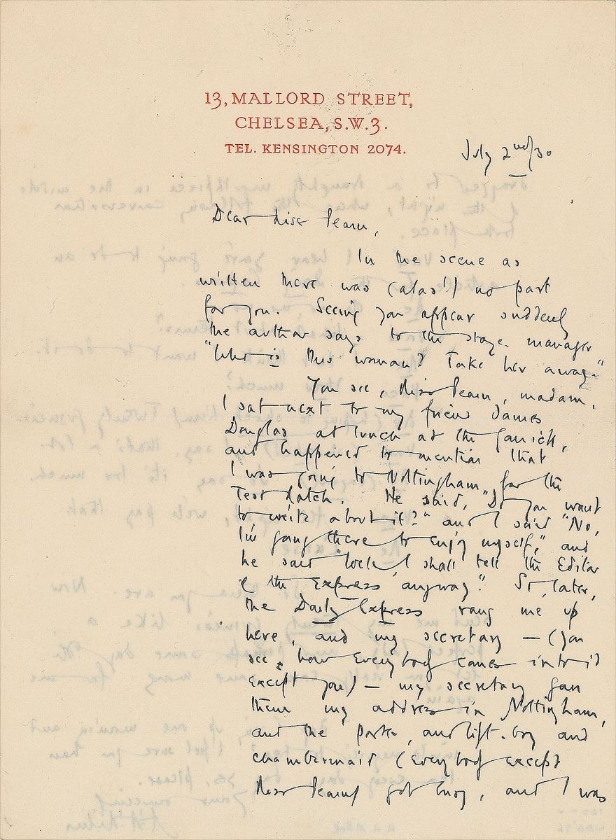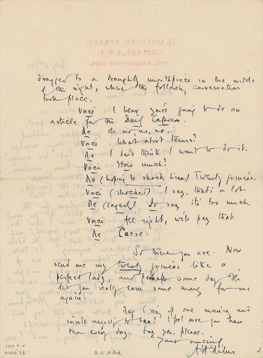 British author (1882–1956) who, despite a large body of novels, plays, and other ‘adult’ writings, will forever be most closely associated with his much-beloved series of Winnie-the-Pooh stories. ALS, one page both sides, 5.5 x 7.5, 13 Mallord Street letterhead, July 2, 1930. Letter to Miss Pearce, in part: “In the scene as written here was (alas!) no part for you. Seeing you appear suddenly the author says to the stage manager, ‘Who is this woman? Take her away.’ You see, Miss Pearce, madam, I sat next to my friend James Douglas at lunch…and happened to mention that I was going to Nottingham for the test match. He said, ‘Do you want to write about it?’ and I said ‘No, I’m going there to enjoy myself,’ and he said ‘Look, I shall tell the editor at the Express anyway.’ So later the Daily Express rang me up here, and my secretary…gave them my address in Nottingham, and the park and lift boy and the chambermaid (everybody except Miss Pearce…), and I was dragged to a naughty mouthpiece in the middle of the night, where the following conversation took place. Voice: I hear you’re going to do an article for the Daily Express, Me: Oh no, no, no, Voice: What about tennis? Me: I don’t think I want to do it, Voice: How much? Me: (hoping to shock him) Twenty guineas, Voice: (shocked) I say, that’s a lot.” In fine condition.